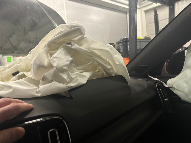 Armaturenbrett ist beschädigt. Gurtstraffer ausgelöst. Dachhimmel gerissen.