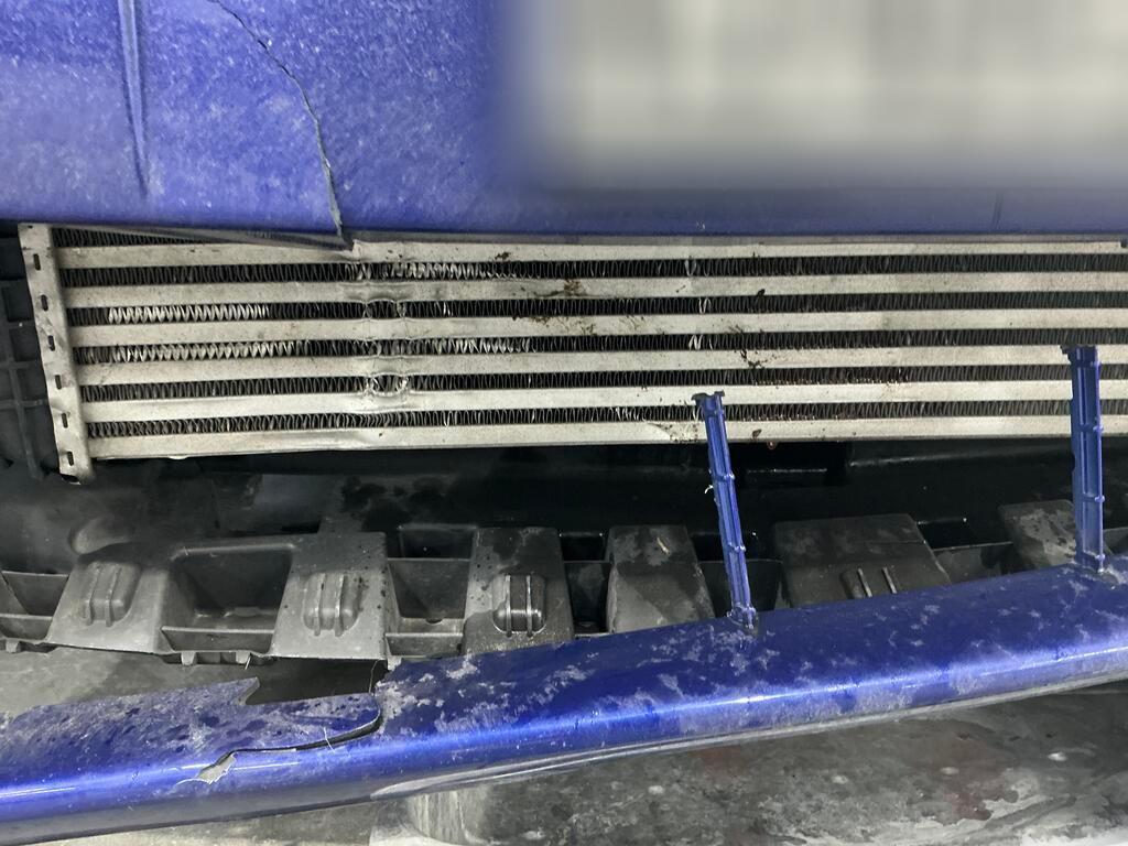 Collision avec un corps mou. Pare-chocs avant, grilles de pare-chocs, projecteurs avant et porte serrures cassés. Condenseur, échangeur d'air et radiateur de refroidissement enfoncés.
