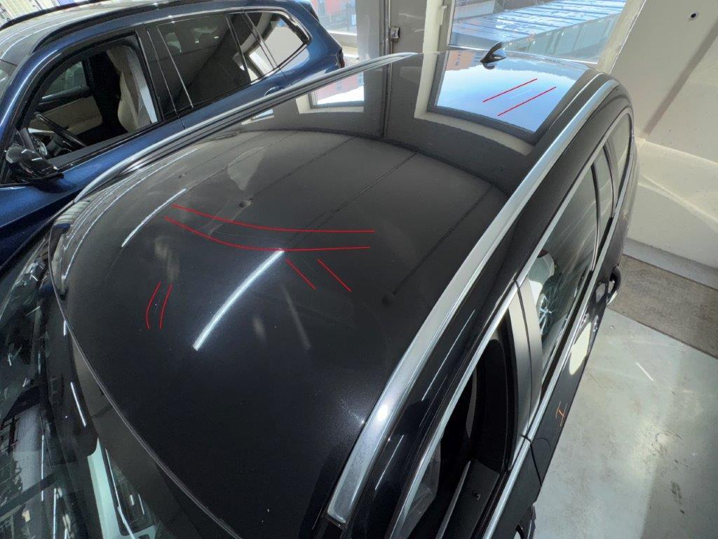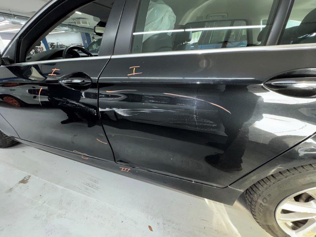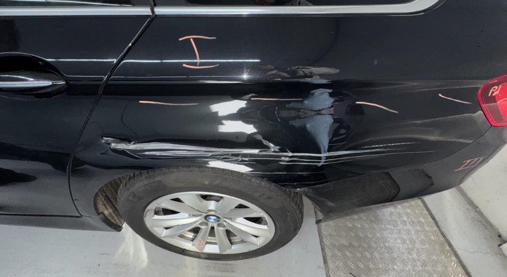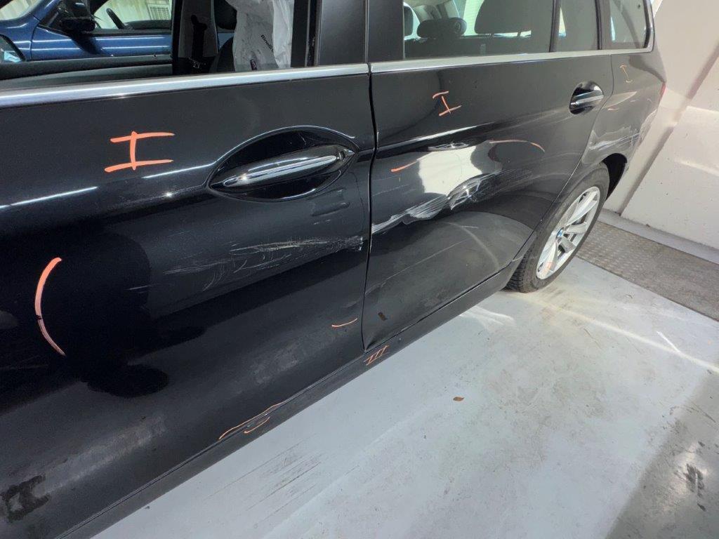 Anprall Seite links: Dabei wurden die Türen, die Seitenwand, das hintere Laufrad und die Stossstange sowie diverse Anbauteile beschädigt. / Diverse Vorschäden und Deformationen rundum (u.A. Kratzer Dachbeplankung, Deformation Stossstange hinten Mitte, Kratzer und Dellen Beifahrertüre, Wassereintritt 3. Bremsleuchte)