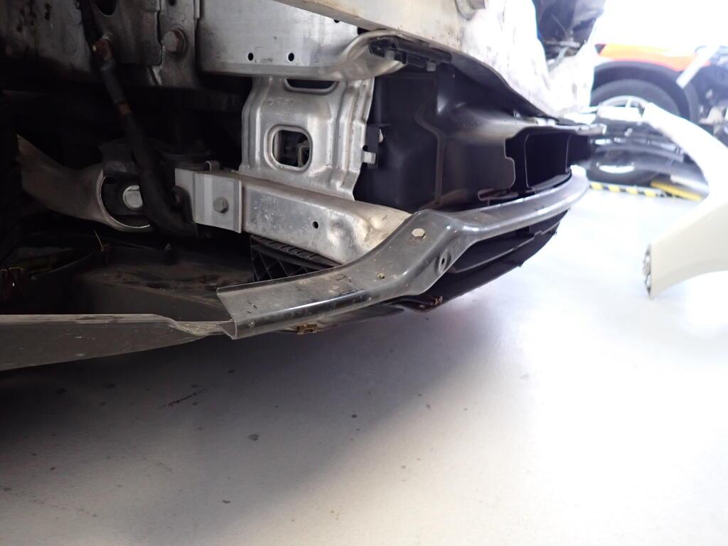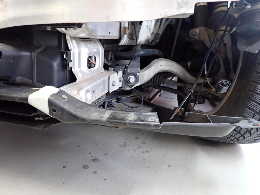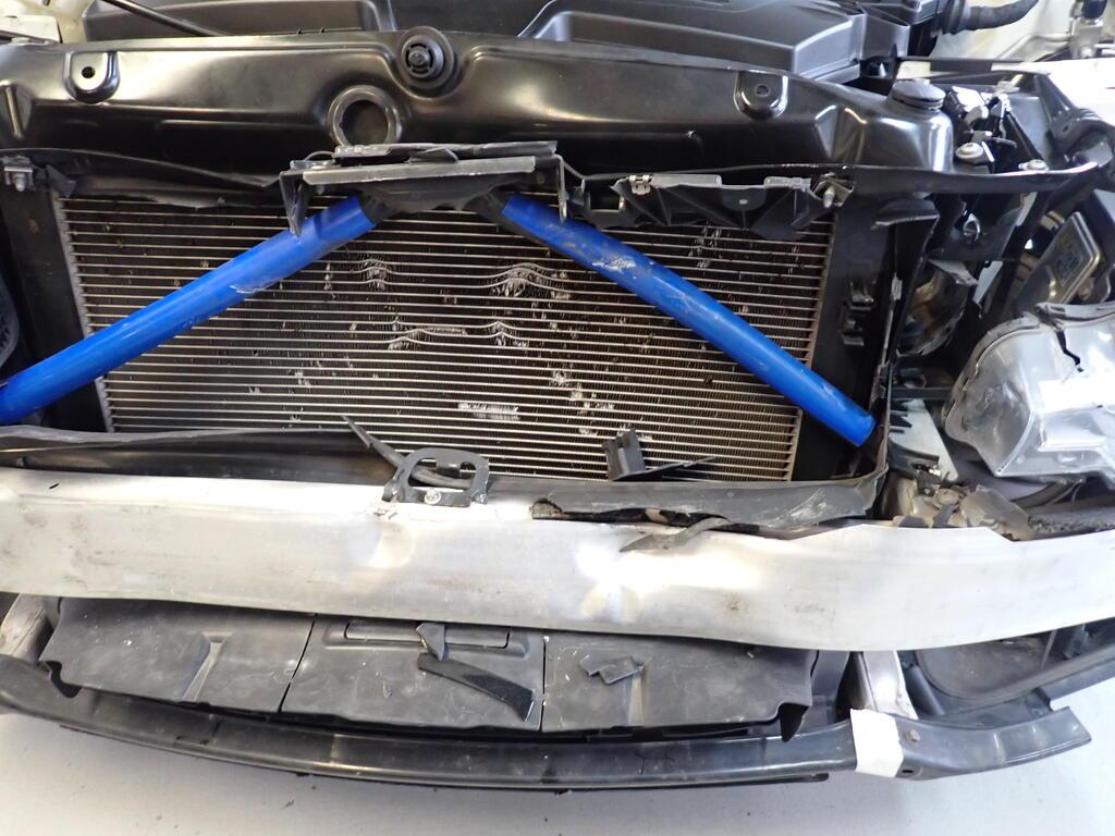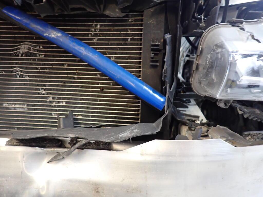 Choc frontal : Avant du véhicule entièrement détruit. Capot moteur refoulé. Tôle frontale, passages de roue avant droit et gauche enfoncés. Longerons avant droit et gauche refoulés. Risques sur l'essieu avant, la direction. Tous les radiateurs endommagés. Ceintures de sécurité avant déclenchées. Risques sur les boîtiers de commande. Le moteur démarre. / Préexistant : traces d'utilisation