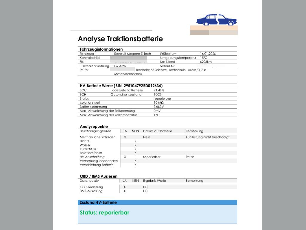 Die Hochvoltbatterie wurde geprüft und ist reparierbar. Das Fahrzeug wird mit der HV-Batterie verkauft. Die HV-Batterie muss durch einen Fachbetrieb zurückgesetzt werden.Der Kilometerstand wurde geschätztDie (vom Fahrzeugexperten) ermittelten Reparaturkosten beziehen sich auf das versicherte Ereignis. Allfällige zusätzliche, nicht versicherte Schäden/Vorschäden, sind in den Reparaturkosten nicht enthalten. Die deklarierten Ausstattungsmerkmale können von der effektiven Ausstattung abweichen.AchtungBei einem Hochvoltsystem - Spannungsfreiheit prüfen. Sicherheitshinweise und Betriebsanleitungen des Herstellers konsultieren und befolgen.
