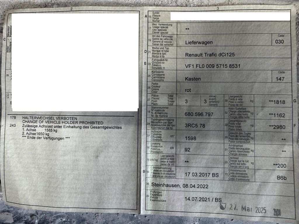 Der Kilometerstand wurde abgelesen. Gebrauchsspuren und kleinere Vorschäden sind möglich.Am Fahrzeug sind Winterräder montiert, keine weitere Bereifung vorhanden.Vor Ort waren: 1 Schlüssel, Ausweis. Motor und Getriebe wurde nicht geprüftWeitere nicht aufgeführte oder verdeckte Schäden sind möglich!Das Holzgestell im Laderaum wird ausgebaut!