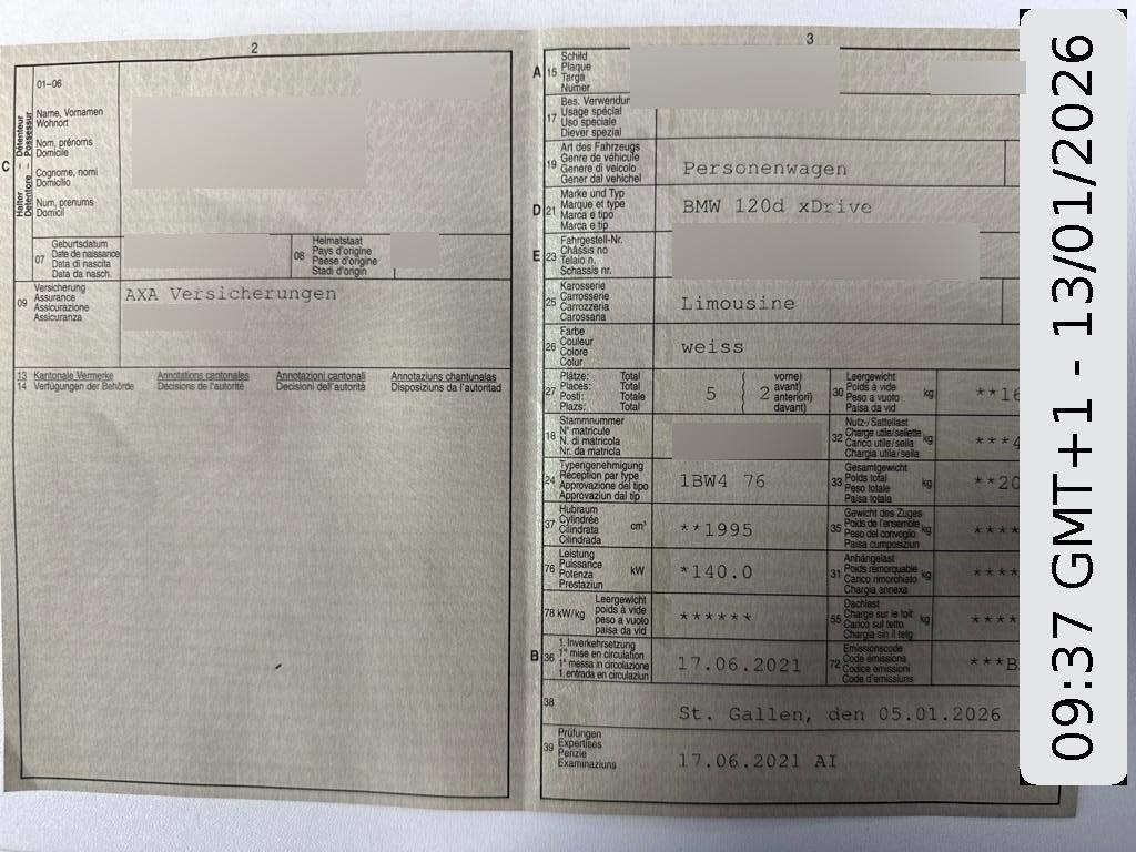 Media: ConnectedDrive Services - Beinhaltet die kostenlose Nutzung von Fahrzeug Apps über BMW Online (inkl. Zugriff auf Wetterinformationen, Nachrichten, Adresssuche etc.) für 3 Jahre - Registrierung erforderlich für personalisierbare Dienste - Der Dienst BMW Online ist ab 2 Wochen vor Ablaufdatum via BMW ConnectedDrive Store kostenpflichtig verlängerbar, Performance Control, Wärme-/Sonnenschutzverglasung, Licht: Begrüssungslicht, Getriebe: 8-Stufen-Automat Steptronic, Allradantrieb permanent, Lenkrad: Multifunktionslenkrad, Steckdose 12V, BMW Live Cockpit, Assist: ATTENTION ASSIST (Aufmerksamkeits-assistent), Airbag: Seitenairbag für Fahrer und Beifahrer, Assist: Crash-Sensor, Seitenaufprallschutz, Klima: Klimaanlage, Paket: Connected Package Professional, Lackierung: Uni-Lackierung, Parkbremse, elektromechanisch, Partikelfilter und Oxydationskatalysator, Kindersitzbefestigung ISOFIX, Condition Based Service, Warndreieck mit Erste-Hilfe-Set, Abschliessbare Radschrauben, Airbag: Airbag Fahrer und Beifahrer, BMW BluePerformance mit AdBlue, Armauflage vorn, klappbar mit integriertem Ablagefach, Assist: Speed Limiter, Airbag: Kopfairbags für alle 4 äusseren Sitzplätze, Dynamische Stabilitätskontrolle (DSC), Intelligenter Notruf, Endrohrblenden, sichtbar, Elektronische Wegfahrsperre, Auto Start Stop Funktion, Regensensor für Scheibenwischer vorne, DAB-Tuner, Servotronic, Fahrerlebnisschalter, Alarmanlage, Antiblockiersystem (ABS), Räder: Reifenreparatur-Set (Tire Fit), Check-Control, Persönliche BMW Service Card, Reifendruck-Kontrollanzeige, Fussmatten in Velours, Airbag: Airbag Beifahrer deaktivierbar, Verzurrösen im Gepäckraum, Personal Profile, Active Guard Plus - Spurverlassenswarnung mit aktiver Rückführung (ab ca. 70 km/h) - Auffahr- und Personenwarnung mit City-Bremsfunktion - Speed Limit Info mit manuellem Speed Limit Assist, Gepäckraumleuchte, Grösserer Kraftstofftank ca. 8 Liter, Media: BMW Live Cockpit Professional - Anzeigeverbund bestehend aus einem volldigitalem 10,25" Instrumentendisplay und einem hochauflösendem 10,25" Control Display - BMW Operating System 7, Navigationsfunktion - Intuitive Bedienmöglichkeiten wahlweise über den BMW Intelligent Personal Assistant - Persönliches Nutzerkonto - 2 USB-Anschlüsse zum Laden und zur Übertragung von Daten, Bluetooth/WiFi-Schnittstelle - 4G LTE Connectivity: festverbaute SIM-Karte mit 4G Netz - Umfang vernetzte Dienste: Teleservices, Notruf,, Getränkehalter, Dachzierleiste in Wagenfarbe, Einstiegsleisten: Aluminiumeinleger mit Schriftzug BMW, Frontstossfänger und Heckstossfänger mit spezifischen Designelementen in Schwarz hochglänzend, Lenkrad: Sport-Lederlenkrad, Räder: 17" Leichtmetallräder Doppelspeiche 549 Orbitgrau, glanzgedreht - 7,5 J×17/Bereifung 225/45 R 17
