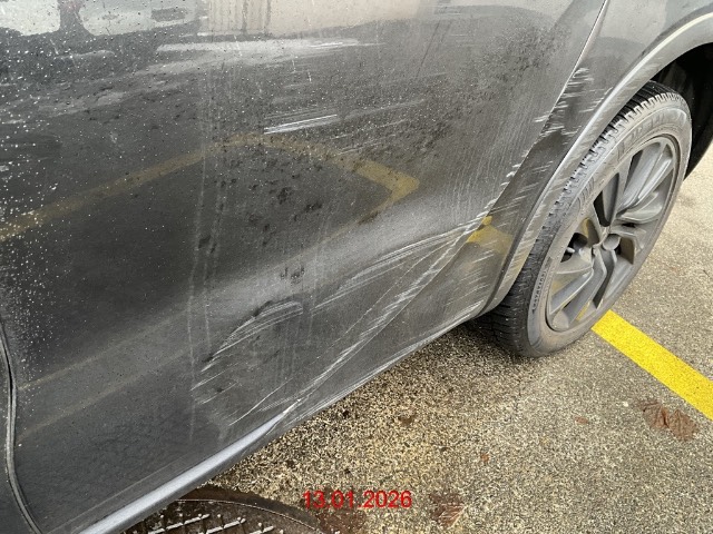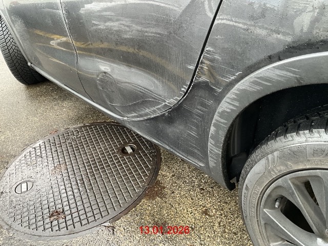 Seite hinten links: Türe und Seitenwand eingedrückt, Radlauf zerkratzt / Vorbestandene Schäden: Gebrauchsspuren