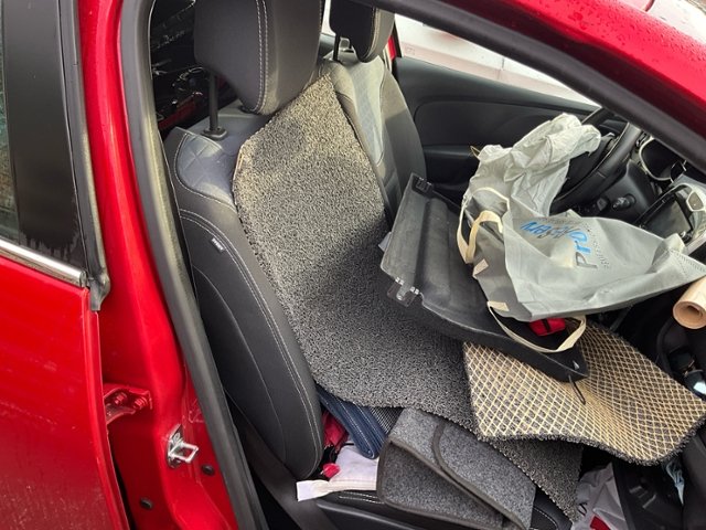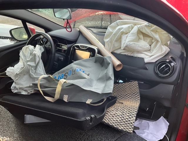 Armaturenbrett ist beschädigt. Gurtstraffer ausgelöst. Starke Verschmutzung im Innenraum.