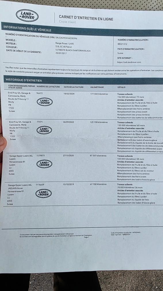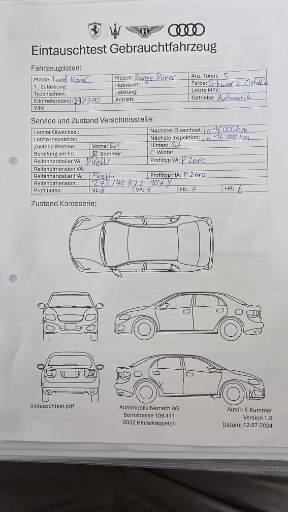Range Rover Vogue 5.0L Exterieur: Schwarz met. ( Foliert 2024 in schwarz matt) 2 Schäden Karrosserie siehe Fotos Felgen nur ganz kleine Gebrauchspuren. Gepflegt. Gummilager etwas ausgeschlagen Trockenes Getriebe + Unterboden ( Siehe Fotos) Sommerreifen von 2023 ca. 6-7 mm. Nächster Service in ca. 15'000km Bremsen Ende 2024 ersetzt . Siehe Fotos Innenraum gepflegt. Türe Fahrerseite etwas abgenutzt 4 Plätzer + Kühlschrank und Bildschirme Langstrecken Fahrzeug Lückenloses Serviceheft bei LANDROVER Offiziell. bis . 177'000km am 03.2024 Siehe Fotos. Letzter Service wurde nicht bei Land Rover gemacht. Für die Laufleistung sehr gepflegt. Fährt ohne jegliche Beanstandungen. Wurde in der Werkstatt von uns geprüft. Siehe Werkstatttest. Händlerfahrzeug ab Platz. Barzahlung bei Abholung. Nach Zusagen Abholung innert 5 Tage. Ansonsten 20.- CHF pro Tag Standgebühren.