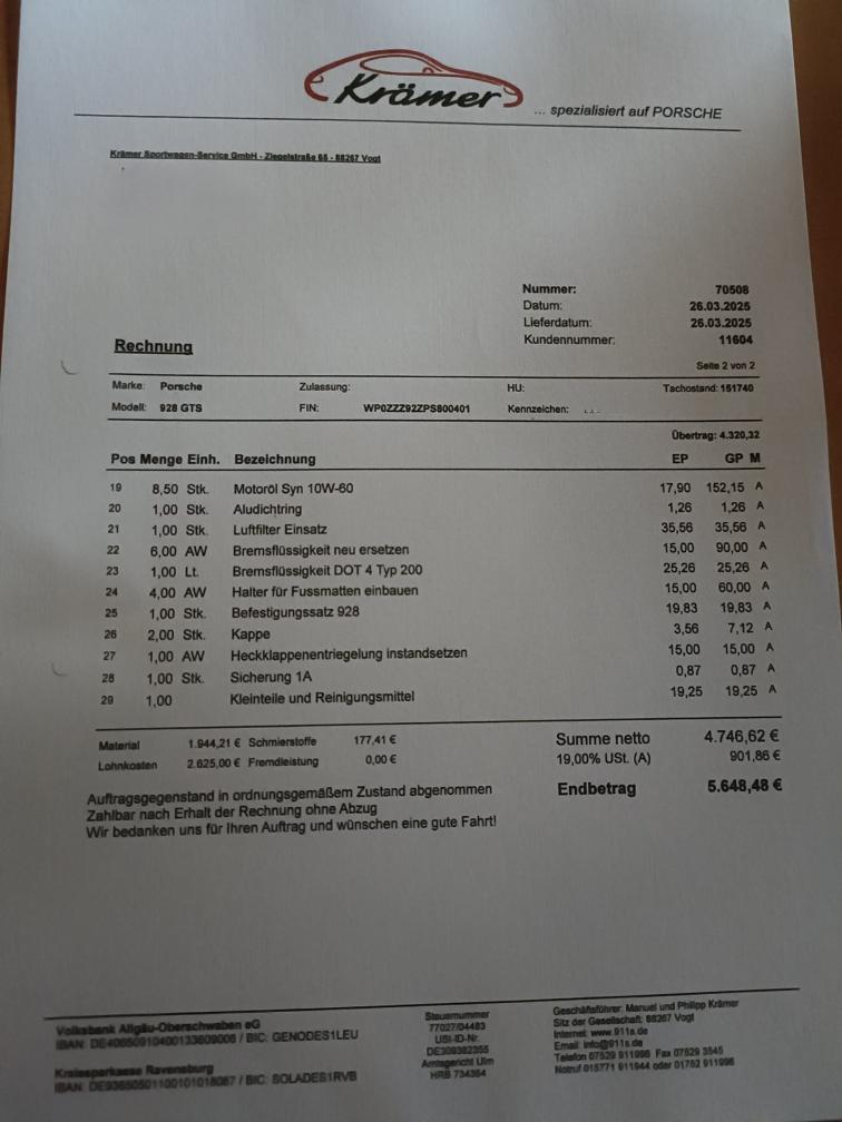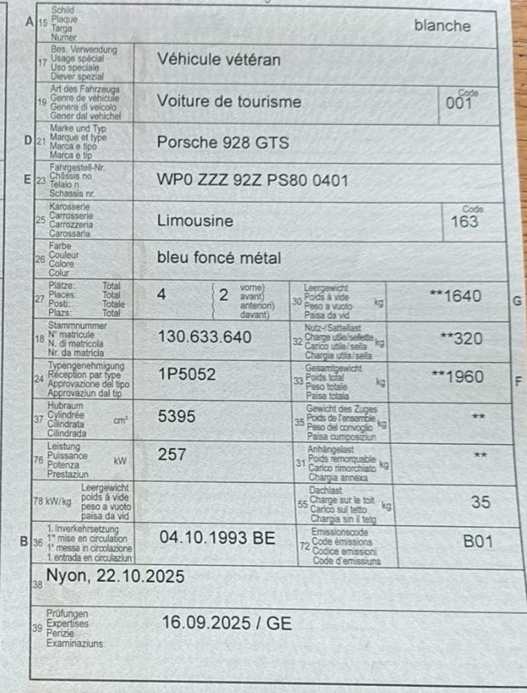 Zum verkauf steht ein 928 GTS „Vétéran” seit dem 17.09.25 mit vollständiger Historie. Laut Kunden ist er innen und außen in einwandfreiem Zustand, dunkelblau mit grauer Lederausstattung, - Der Verkäufer ist der dritte Besitzer. - Große Service wurde gerade durchgeführt - Neue Winter- und Sommerreifen. - Er verfügt über DAB+ Navi Porsche Classic. Am Fahrzeug wurde kein Werkstatttest gemacht (Für sichtbare oder nicht sichtbare Mängel wird nicht gehaftet). Wir testen & kontrollieren nicht alle Funktionen vom Fahrzeug. Das Risiko liegt somit vollumfänglich beim Käufer. Nachdem der Höchstbietende den Zuschlag erhalten hat, gibt es keine Nachverhandlung, auch wenn nicht deklarierte Mängel zum Vorschein kommen sollten.