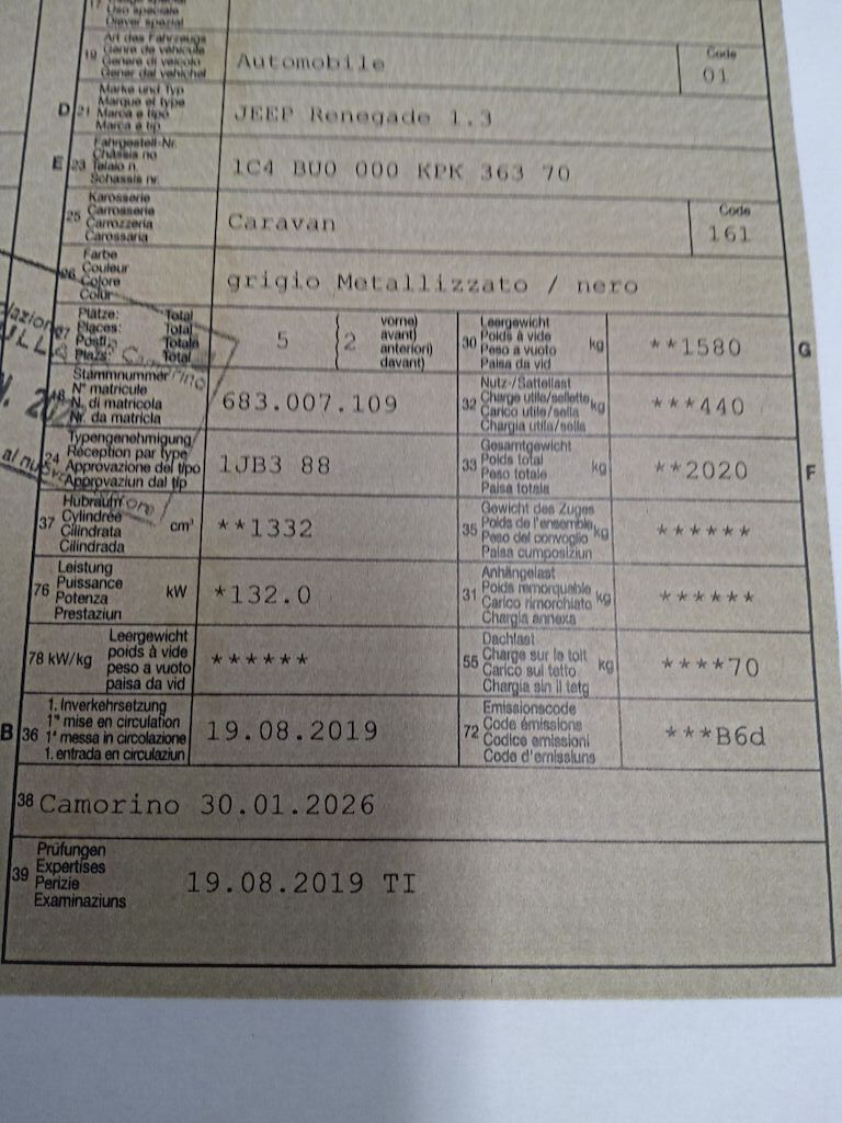 Non è stata effettuata alcuna ispezione tecnica (prova in officina) Veicolo grandinato Piccolo segno porta anteriore SX Plastica parafango posteriore DX rigata Parafango e porta anteriore DX rigati Volante usurato Seconda chiave disponibile Motor Getriebe Vorderachse Hinterachse Airbags ausgelöst: 0 Nein ( Abfallcode 16.01.04ak )
