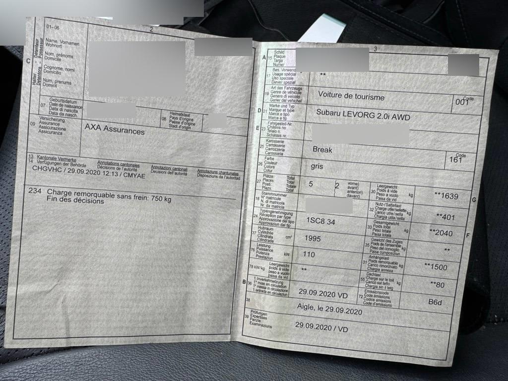 Seitenaufprall-Schutzsystem, Assist: Park Distance Control hinten, Komfortblinker, Wärmeschutzverglasung, Polster: Leder-Ausstattung, Klima: Fussheizung (vorne, hinten), Räder: Reifendruck-Kontrollanzeige, Licht: Fernlicht-Assistent, Keyless Entry / -Start, Servolenkung, Sport-Frontgrill, Lenkrad: Lenkrad beheizbar, Bordcomputer, Licht: LED-Abbiegelicht, Zentralverriegelung mit Fernbedienung, Räder: Reifenreparatur-Set (Tire Fit), Gurtstraffer vorne und hinten, Assist: Berganfahrhilfe (Hill Holder), Media: Navigationssystem, Lackierung: Uni-Lackierung, Lenkrad: Lenkrad und Schalthebelgriff in Leder, 3-Punkt-Sicherheitsgurte auf allen Plätzen, Laderaumabdeckung, Pedal Release System Auskuppelnde Sicherheitspedale PRS, Steckdose im Kofferraum, Innenspiegel automatisch abblendbar, Elektrisches Glasschiebedach, Assist: Bremsassistent (BAS), Klima: 2-Zonen-Klimaautomatik, Elektronisches Stabiliäts-Programm (VDC), Cupholder, Sitze: Vordersitze elektrisch verstellbar, Assist: Bergabfahrhilfe (DAC), Assist: EyeSight Fahrerassistenz-System: Adapt.Tempomat,Spurhalte-,Spurleit-,Not- brems-,Kollisionschutz-,Anfahr-/Assisten, Cockpit-Applikationen im Silber-Look, Sitze: Kreuzstütze für Fahrersitz elektrisch verstellbar, Assist: Querverkehrsassistent hinten, Licht: Tagfahrlicht, Sitze: Sportsitze vorne, Heckscheibenheizung, Assist: Berganfahrhilfe (Hill Assist Control - HAC), Gurtkraftbegrenzer vorne und hinten, Lenkrad: Multifunktionslenkrad, Media: Bluetooth-Freisprechanlage mit Spracherkennung (Apple CarPlay / Google Android Auto), Scheibenwischer-Enteiser, Airbag: Window-Kopfairbags, Lenkrad: Lenkrad längs- und höhenverstellbar, Sitze: Vordersitze heizbar, Aktive Kopfstützen, Aussenspiegel rechts und links beheizt, elektrisch verstell- / und einklappbar, Stopp-/Start-System, Heckscheiben-Wisch-/Waschanlage mit Intervall, Tageskilometerzähler, Räder: Leichtmetallfelgen 7.5Jx18 225/45R18 ET55, SI-Drive-System, Gurtkontrolle, Airbag: Knie-Airbag für Fahrer, Elektrische Fensterheber vorne + hinten, Assist: Frontkamera, Katalysator geregelt, Blinker in Aussenspiegel, Media: USB+AUX-Anschluss, Scheibenwischer vorne mit Intervall, Tankdeckel-Entriegelung von innen, 12-Volt-Steckdose vorne, Allradantrieb permanent, Sitze: Fahrersitzhöhen- und Neigungsverstellung, Sitze: Beifahrersitz neigungsverstellbar, Digital Uhr, Kopfstützen vorne höhenverstellbar, Sitze: Rücksitzlehne geteilt abklappbar, Innenrückspiegel mit Monitorfunktion, Aussentemperaturanzeige, Multifunktionsdisplay, ISOFIX Kindersitzvorrichtung, Drehzahlmesser, Airbag: Airbag Fahrer und Beifahrer, Kopfstützen hinten höhenverstellbar, Licht: Nebelschlussleuchte, Frontspoiler, Abgedunkelte Seiten- und Heckscheibe, Pollenfilter (Staubfilter), ABS, EBD elektronische Bremskraftverteilung, Media: Radio-CD-Gerät mit MP3-/WMA-Leser, DAB+, 6 Lautsprechern und 7'-Touchscreen, Airbag: Seitenairbag für Fahrer und Beifahrer, Scheinwerfer-Waschanlage, Licht: Drittes Bremslicht, Wegfahrsperre elektronisch, Assist: Totwinkel-Assistent, Assist: Rückfahrkamera mit Monitor, Getriebe: 7-Stufen-Automat CVT sequentiell, Licht- und Regensensor