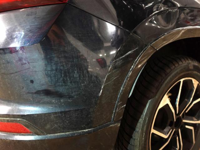 Stossstange hinten rechts beschädigt, Stossstange vorne rechts beschädigt, Motorhaube verbeult und zerkratzt, Rückspiegel rechts beschädigt, Sitzbezug rechts beschädigt