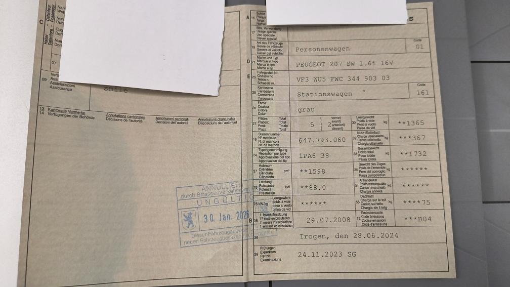 Fährt, schaltet und bremst. Laut Kunde läuft der Peugeot manchmal nicht auf allen Zylinder, bei erneutem Starten läuft er aber ohne Problem. Gebrauchtes Fahrzeug kann diverse Kratzer und Beulen aufweisen. Fahrzeugbereifung und Ausstattung gemäss Foto. Keine mechanische Prüfung, Fahrzeugkauf auf eigenes Risiko ab Platz ohne Nachwährschaft. Die Gewährleistung für Sachmängel wird wegbedungen. Muss innert 5 Tagen bezahlt und abgeholt werden.