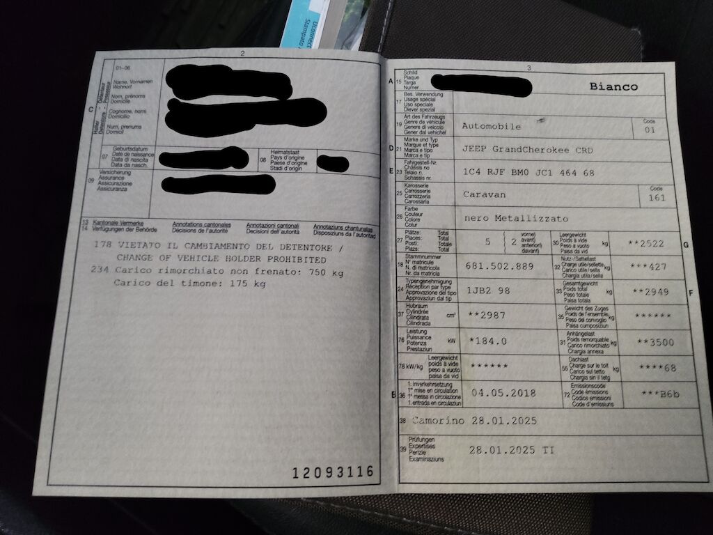 Non è stata effettuata alcuna ispezione tecnica (prova in officina) Le spie di avvertimento si accendono durante il funzionamento. FAP e catalizzatore NOX da sostituire Piccoli segni di usura Piccolo danno paraurti anteriore SX Bollo parafango posteriore DX e profili leggermente graffiati Ritocco porta posteriore DX Seduta sedile di guida usurata Veicolo dotato di gancio traino amovibile Motor Getriebe Vorderachse Hinterachse Airbags ausgelöst: 0 Nein ( Abfallcode 16.01.04ak )