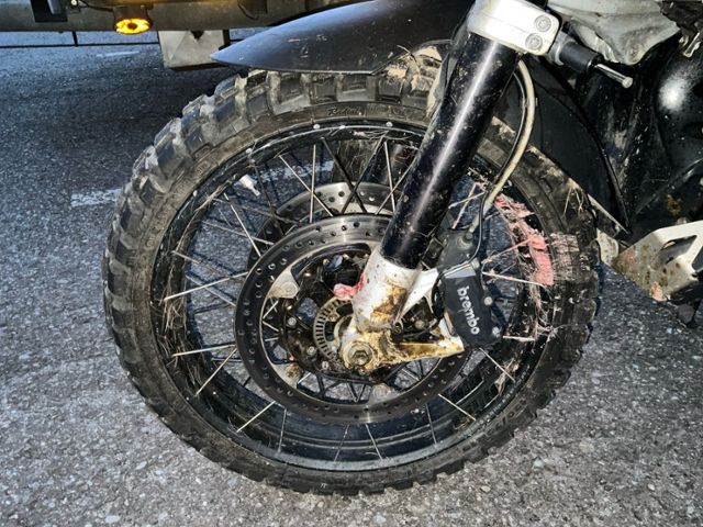 Schutzblech vorne defekt. Gabel beschädigt. Lenker verbogen.