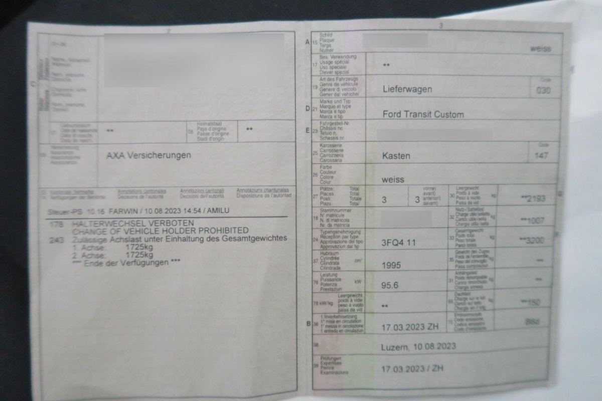 Räder: Reifen-Reparatur-Set - platz- und gewichtsparend, anstelle Reserverad (bei Verwendung max. 80 km/h zulässig), Elektronisches Stabilitäts-Programm (ESP), Assist: Anhängerstabilisierung, Lenkrad: Lederlenkrad, Servolenkung, Licht: Halogen-Projektscheinwerfer inkl.LED Tagfahrlicht Nebelscheinwerfer und Abbiegelicht Abbiegelicht im Nebelscheinwerfer bis 30km/h, 3-Punkt-Sicherheitsgurte auf allen Plätzen, Sonnenblende links, Lenkrad: Lenksäule in Höhe und Reichweite einstellbar, Dachhimmel, Innenverkleidung für Kotflügel vorn, Aussenspiegel mit integrierten Blinkleuchten, Generator (240 A), Paket: Kaltstart-Paket inkl. 2 Batterien, Assist: Notbremsunterstützung inkl. Notbremslicht, 8 Verzurrösen, Handschuhfach mit Deckel, abschliessbar, Partikelfilter und Oxydationskatalysator, Assist: Park Distance Control vorne und hinten + Nebelscheinwerfer, Ford Garantie: Ford Protect Garantie-Schutzbrief 3 Jahre oder 100'000 km (ab 1. Inv.), Assist: Traktionskontrolle, Getriebe: 6-Stufen-Automat, Kühlergrill - 3 Streben und Einfassung in Kunststoff schwarzgrau, Türen: Heckdoppelflügeltüren 180° (ohne Fenster), Licht: Dritte Bremsleuchte, Klima: Elektrischer Zuheizer, Überschlagschutz, Klima: Manuelle Klimaanlage vorn (inkl. Pollenfilter), Assist: Geschwindigkeitsbegrenzer 120 km/h, Schmutzfänger vorne und hinten, Kraftstofftank 70 Liter, Assist: Berganfahrhilfe, Räder: Stahlräder 6.5 J x 16 mit 215/65 R 16 Reifen, Licht: Nebelschlussleuchte, Aussenspiegel beheizt, elektrisch verstellbar, Antiblockier-Bremssystem (ABS) mit elektronischer Bremskraftverteilung (EBD), Media: Audio 17 DAB+ - FordPass Connect - 4"-TFT-Multifunktionsdisplay - Integriertes Bedienfeld und Audio-Fernbedienung am Lenkrad - Bluetooth - USB-Anschluss und Freisprecheinrichtung, Laderaumbeleuchtung inkl. aktivierbarer Ausschaltverzögerung (30 Minuten), Innenraumbeleuchtung vorne mit 2 Leselampen, Warnsystem für nicht angelegten Sicherheitsgurt - Fahrer und Beifahrersicherheitsgurt, Sicherheitsgurte auf allen Plätzen, Bordcomputer mit Verbrauchs- und Kilometerangaben (z. B. Restreichweite) und Aussentemperaturanzeige, Garantie: 2 Jahre Werksgarantie (unbeschränkte Kilometerleistung), Schiebetür-Einstiegsleuchte (automatisch bei Türöffnung), Garantie: Garantie gegen Durchrostung 12 Jahre (nach Ablieferung), Räder: Radzierblenden, Assist: Geschwindigkeitsregelanlage mit Lederlenkrad und einstellbarem Geschwindigkeitsbegrenzer, Media: FordPass Connect, Laderaumboden 'Easy Clean', Sicherheitsgurtstraffer und -gurtkraftbegrenzer vorn, Start/Stop-Funktion, Scheibenwischer vorne mit Intervall, Airbag: Airbag Fahrerseite, Assist: Seitenwindassistent, Sonnenblende rechts, Fensterheber vorn, elektisch mit Quick Up-/Down Schaltung für Fahrer, Lackierung: Uni-Lackierung, Scheibenbremsen vorne und hinten, Seitenschutz-Zierleisten, Assist: Sicherheits-Bremsassistent, Wärmeschutzverglasung, leicht getönt, 12-Volt-Steckdose vorne, Ford Easy Fuel (verhindert die Möglichkeit der Fehlbetankung)