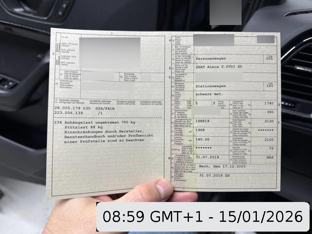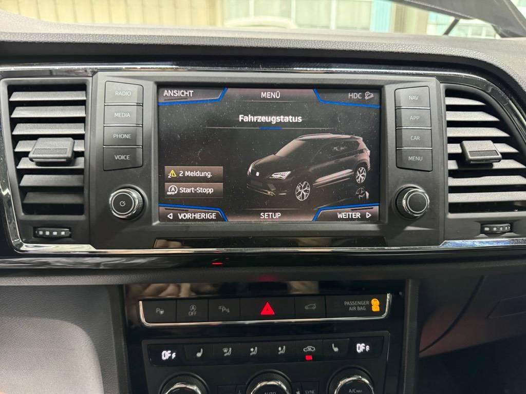 Assist: Multikollisionsbremse, Radiovorbereitung, Antenne, Entstörung und 8 LS, Partikelfilter und Oxydationskatalysator, Sonnenblende Fahrer und Beifahrerseite mit beleuchtetem Spiegel, Licht: LED-Nebelscheinwerfer mit Abbiegelicht, 3-Punkt-Sicherheitsgurte auf allen Plätzen, Lenkrad: Multifunktionslenkrad, Zentralverriegelung mit Fernbedienung, Bordcomputer, Licht: LED Scheinwerfer, Dekorblenden Interieur, Abgedunkeltes Scheibenglas (ab B-Säule), Elektronische Differentialsperre (XDS), Assist: Tempomat, Servolenkung geschwindigkeitsabhängig, Airbag: Fahrer und Beifahrer Airbag, Airbag: Seitenairbag für Fahrer und Beifahrer, Assist: Speedlimiter, Media: 8'' Farbdisplay (Touchscreen), Sitze: Vordersitze höhenverstellbar, Bremsenergie-Rückgewinnung, Teppichfussmatten vorne und hinten, Fahrer-Informationssystem monochrom, Progressivlenkung, Klima: 2-Zonen-Klimaautomatik, Polster: Sitzbezüge in Dinamica sowie Dekorblenden in "schwarz", Easy-Entry Lehnenentriegelung, Innenspiegel automatisch abblendbar, Airbag: Window-Kopfairbags, Sitze: Rücksitzlehne geteilt abklappbar 1/3 - 2/3, Einstiegsleisten in Aluminium, 2 Schlüssel mit Fernbedienung, Licht: LED Heckleuchten, Allradantrieb permanent, Media: SDXC-Kartenleser, Media: USB-Anschluss, Sitzbezüge in Dinamica 'black', Elektronisches Stabilitäts-Programm (ESP) mit Reifendruckkontrolle, Bremsassistent (BAS) und Sperrdifferential, Sitze: Mittelarmlehne vorne, Fensterschachtzierleisten in Aluminium, Airbag: Knie-Airbag für Fahrer, Media: Sprachsteuerung, Media: SEAT Media System Plus, Kopfstützen hinten (3), Schublade unter Fahrersitz, Elektronische Parkbremse, Getriebe: 7-Gang-Sequentielle-Getriebe mit Automatikfunktion, Assist: Müdigkeitserkennung, Assist: Auto-Hold-Funktion, Media: DAB+ (Digital Audio Broadcasting), Wegfahrsperre elektronisch, Media: CD-Laufwerk, Aussenspiegel und Türgriffe in Wagenfarbe, Media: Mobiltelefon Freisprecheinrichtung Bluetooth, Gurtkontrolle, Seitenschutz-Zierleisten in aluminium Look, 4 Leichtmetallfelgen 18J mit Pneu, Assist: Umfeldbeobachtung 'Front-Assist' mit City-Notbremsfunktion, ABS, EBD elektronische Bremskraftverteilung, Radlaufblenden in Wagenfarbe, Fensterheber Elektrisch vorne + hinten, Fahrprofilauswahl, Kühlergrill schwarz, USB Anschlüsse in der hinteren Mittelkonsole 2x, Einstiegsleisten beleuchtet, Licht: Coming-home-Funktion, Lenkrad: Lenkrad und Schalthebelgriff in Leder, Gurte Höhenverstellbar vorne, Sitze: Lendenwirbelstütze vorne manuell, Dachreling schwarz, Kopfstützen vorne höhenverstellbar, ISOFIX Kindersitzvorrichtung, Aussenspiegel rechts und links beheizt, elektrisch verstell-/ und einklappbar, Sitze: Mittelarmlehne hinten, Gurtstraffer vorne, Räder: Reifenreparatur-Set (Tire Fit), Airbag: Beifahrerairbag deaktivierbar, Assist: Fussgängerschutz, Media: AUX-Anschluss, Innenleuchten LED, Assist: Automatische Distanzregelung ACC, Assist: Einparkhilfe vorne und hinten mit optischer Anzeige, Assist: Top View Camera (Rundumblick), Heckklappe elektrisch öffnend ''Virtual Pedal'', Media: SEAT Connectivity Box, Media: SEAT FullLink, Navigationssystem, Parklenkassistent, Schliess- und Startsystem KESSY