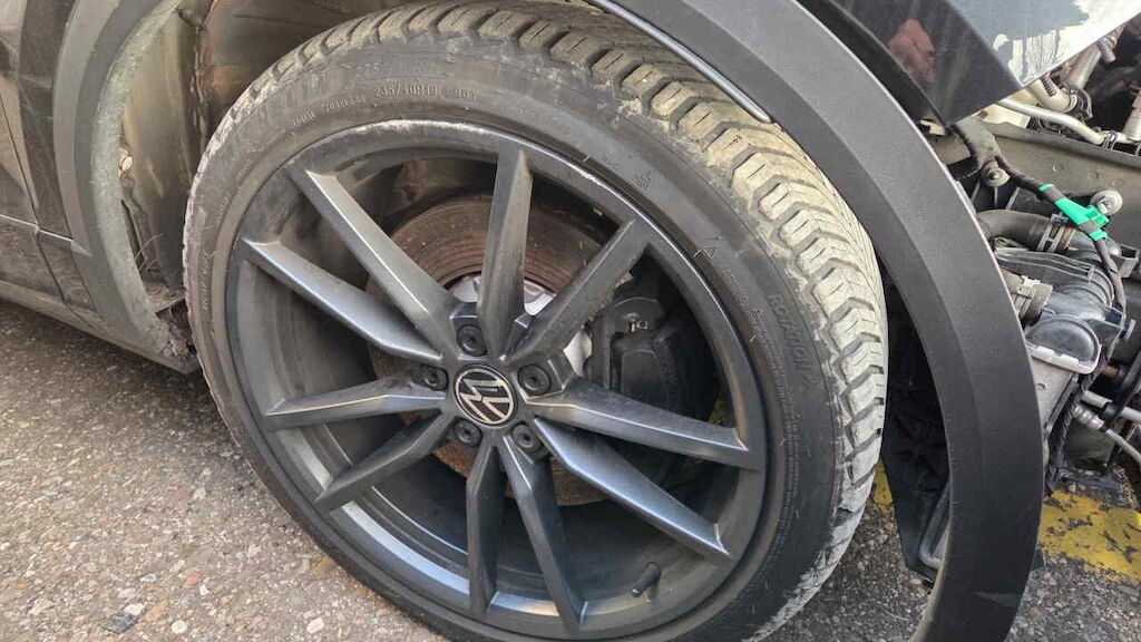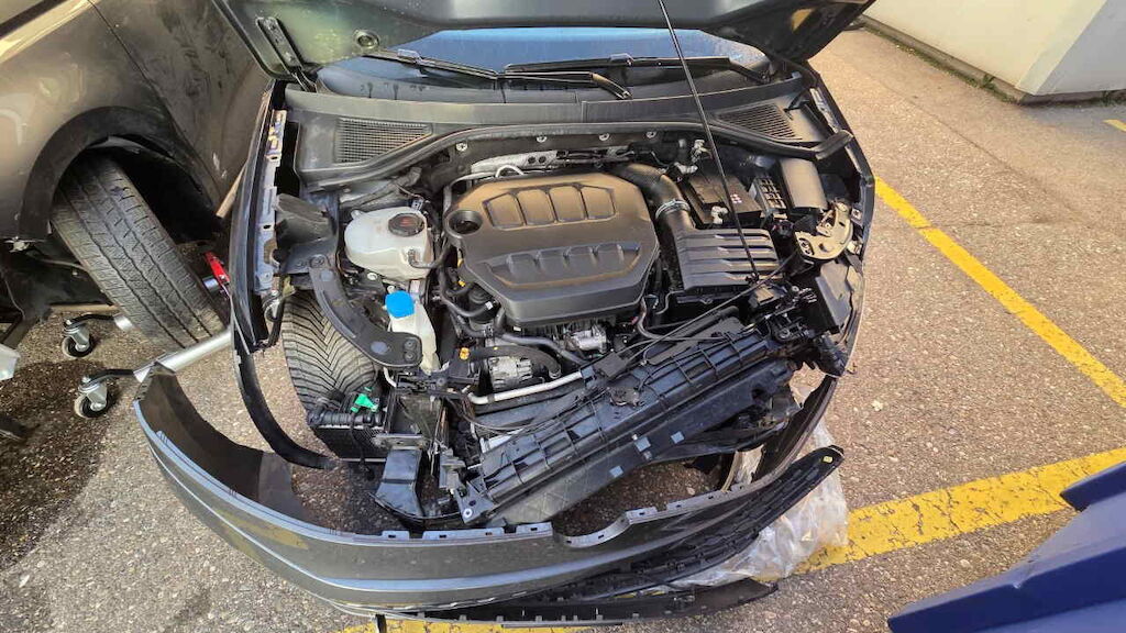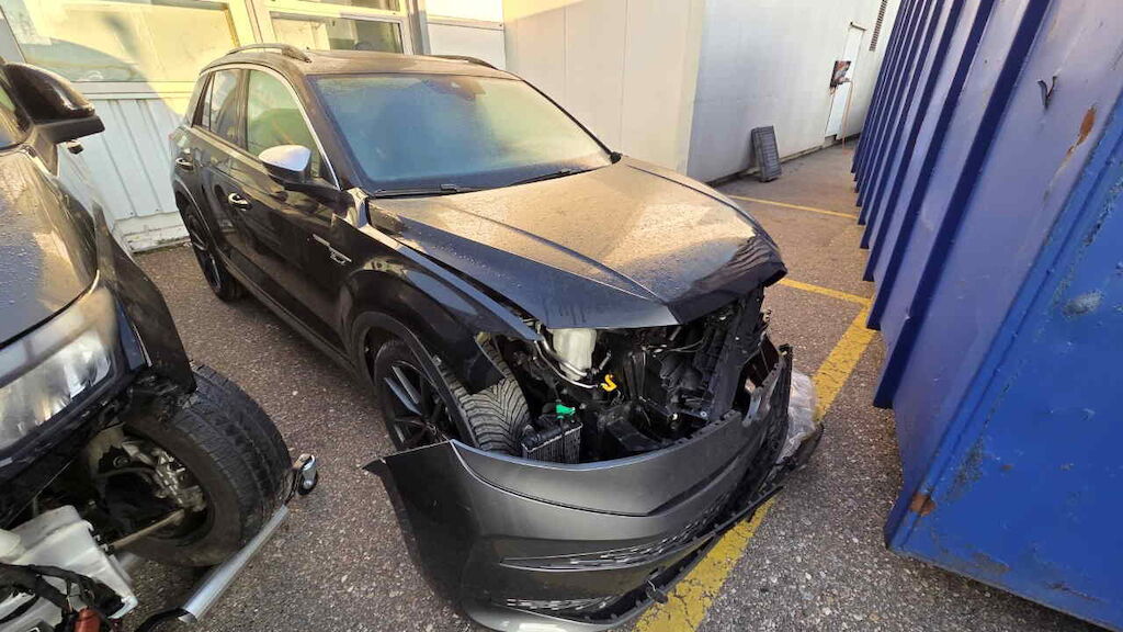 Fahrzeug unzerlegt auf Platz besichtigt Motor und Getriebe konnte nicht geprüfte werden Front nach rechts verschoben Stossfänger mit Träger und Halter, Kühlergrill, Lampen, Scheinwerfer, Motorhaube, Schlossträger, Kühlerpaket, Kotflügel und Türen vl und vr beschädigt Fahrwerk vorne beide Felgen vo, Reifen vl beschädigt Längsträger li und re nach rechts verschoben Motor Getriebe Vorderachse Hinterachse Airbags ausgelöst: 0 unbekannt ( Abfallcode 16.01.04ak )