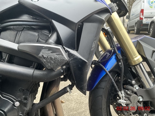 Seite rechts : Schalldämpfer, Spoiler unten, Lenker, Rückspiegel, Kupplungshebel, Fussbremshebel, Abdeckung vorne rechts beschädigt. / Linke Seite diverse Vorschäden : Lenkerende, Rückspiegel, Sturzpad, Abdeckungen , Tank leichte Beule