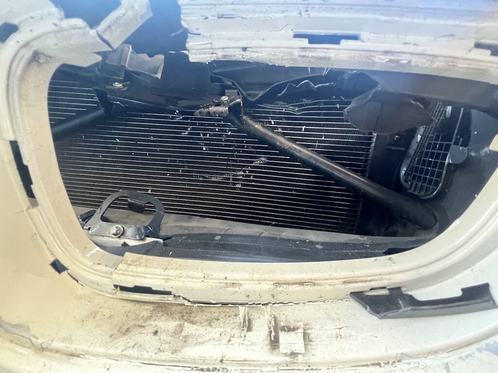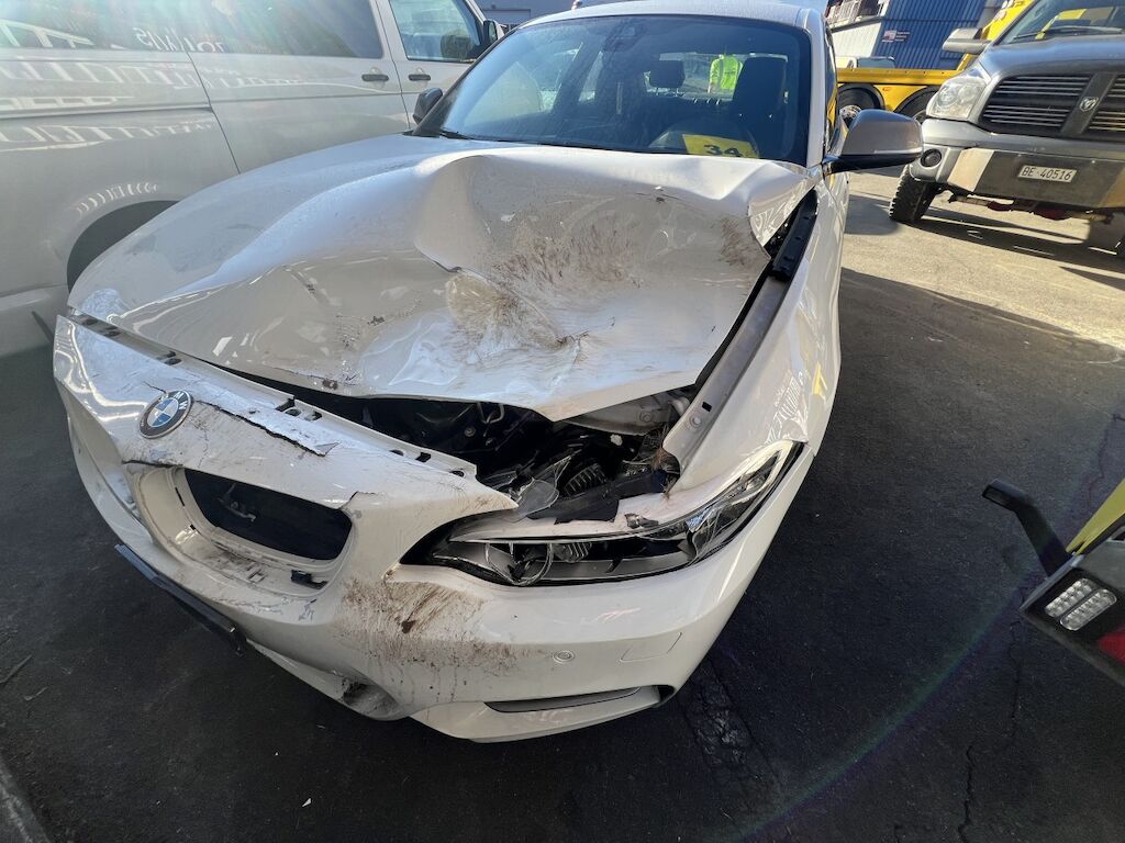Front mit Anbauteilen eingedrückt und aufgestaucht. Scheinwerfer und div. Anbauteile gebrochen. Frontträger und Frontmaske nach innen gedrückt. Div. Luftführungen, Kondensator, Kühler, Lüfter, Luftfiltergehäuse, etc. beschädigt. Beide Kotflügel def. Türe und A-Spiegel v.l. beschädigt. Motor läuft, hat aber Kontakt mit Fremdteilen. Kl. Risiko. Motor Getriebe Vorderachse Hinterachse Airbags ausgelöst: 0 unbekannt ( Abfallcode 16.01.04ak )