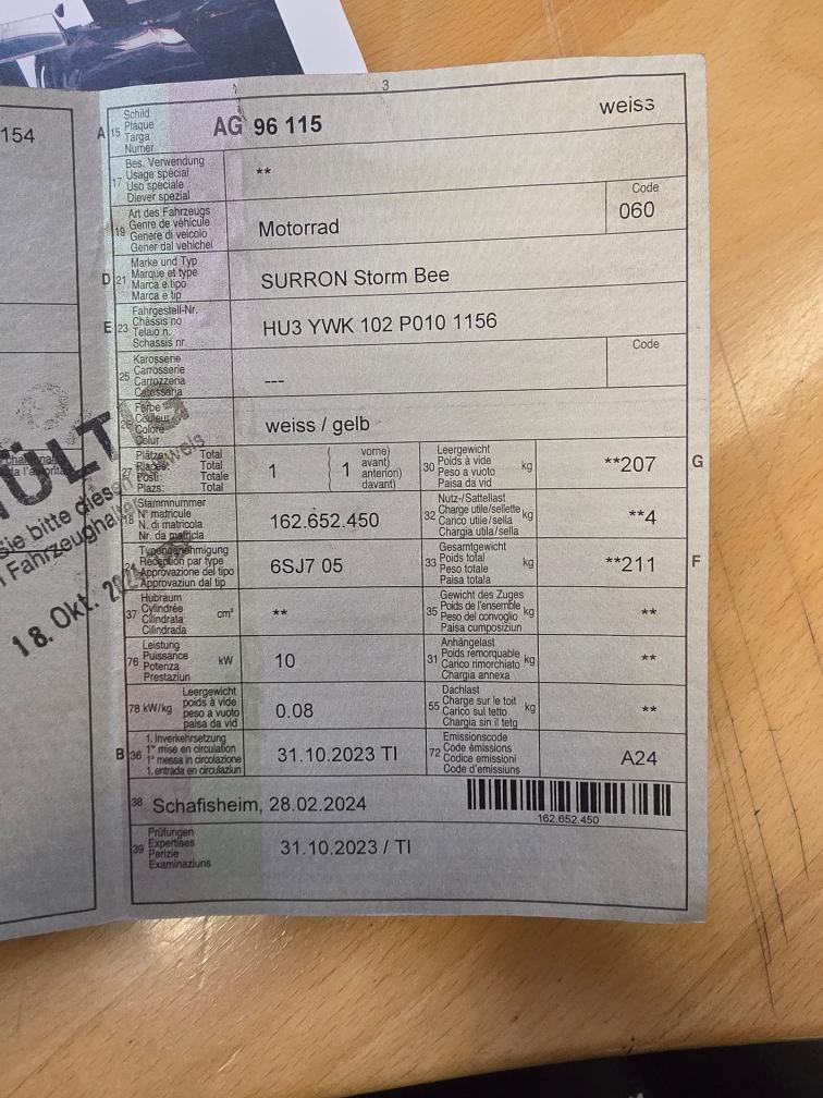 Sur-Ron Storm Bee – Strassenzulassung – 10 kW – Top Zustand Zum Verkauf steht eine Sur-Ron Storm Bee mit Strassenzulassung. Kraftvolles E-Motorrad mit viel Drehmoment und Fahrspaß – ideal für Alltag und Landstrasse. Highlights: 10 kW Leistung Strassenzulassung / Typengenehmigung Erstzulassung: 31.10.2023 Reichweite bis ca. 200 km (je nach Fahrweise) Farbe: weiss / gelb 1 Sitzplatz Leergewicht ca. 207 kg Emissionscode A24 Zustand & Nutzung: Nur 1 Sommer gefahren Kein Offroad, ausschliesslich Strasse Laufleistung: ca. 600 km Mängel (transparent angegeben): Bremshebel leicht beschädigt Gummi beschädigt, jedoch nicht störend und voll funktionstüchtig Motorrad ist technisch einwandfrei und fährt problemlos. Alle dokumente und Ladegerät dabei