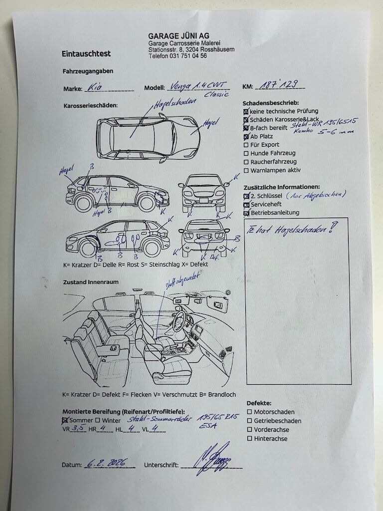 Hagelschaden und diverse weitere Carrosserieschäden Motor Getriebe Vorderachse Hinterachse Airbags ausgelöst: 0 unbekannt ( Abfallcode 16.01.04ak )