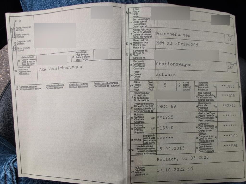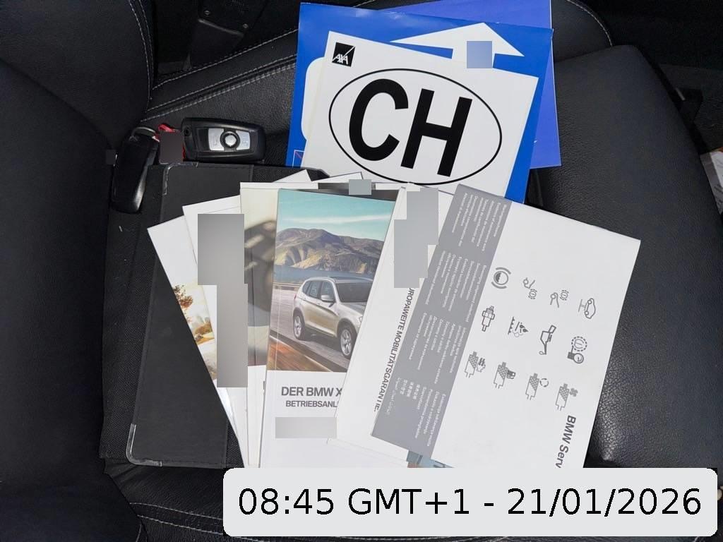 Assist: Dynamische Traktionskontrolle (DTC), Nebelscheinwerfer, Tagfahrlicht, Make up-Spiegel rechts, Bremsassistent (BAS), Elektrische Lenkung (EPS), Steckdose, Assist: Cornering Brake Control (CBC), Veloursfussmatten vorne und hinten, Rücksitzlehne geteilt abklappbar, Kopfstützen und Mittelarmlehne abklapp- bar hinten, Assist: Tempomat mit Bremsfunktion, Lackierung: Uni-Lackierung, Verbandskasten, Aussentemperaturanzeige, Vordersitze höhenverstellbar, Partikelfilter und Oxydationskatalysator, Steckdose 12V, Stereolautsprechersystem mit 5 LS, Dekor: Interieurleisten in Satinsilber matt, Befestigungsösen im Laderaum, Nichtraucherausführung, Lenkrad: Lenkrad längs- und höhenverstellbar, Leichtmetallfelgen im V-Speiche 304, 17J, AUX-Anschluss, Drittes Bremslicht, Elektrische Fensterheber vorne + hinten, Radio BMW Business CD, Sicherheitstrennnetz oder /-gitter im Gepäckraum, Scheibenwischer vorne mit Intervall, Airbag: Seitenairbag für Fahrer und Beifahrer, Dynamische Bremsleuchten, Airbag: Airbag Fahrer und Beifahrer, Reifendruckverlust-Warnsystem, Lenkung, elektrisch unterstützt, Window-Kopfairbags, Lenkrad: Multifunktionslenkrad, Automatische Parkbremse, 8-Stufen-Automat sequentiell, Bremsbelag-Verschleissanzeige, Zentralverriegelung mit Fernbedienung, Auto Start-/Stop-Anlage, Antiblockiersystem (ABS), Make up-Spiegel links, Sitzbelegungserkennung für Airbags, Hill Descent Control (HDC), Allradantrieb permanent, Aktive Kopfstützen, Check-Control-System, Stoff-Ausstattung, Abschliessbare Radschrauben, Schlüsselloser Motorstart, Bremsenergie-Rückgewinnung, Wegfahrsperre elektronisch, ISOFIX Kindersitzvorrichtung, BMW Mobility System, Assist: Crash-Sensor, Klimatisierungsautomatik, Start-/Stop-Knopf, Dynamische Stabilitätskontrolle (DSC), Cupholder
