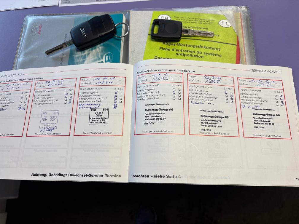 Letzter Service 09.2025 / 219'783 km Bremsen hinten sind neu Sehr gute Winterreifen Zeitweise leuchtet ABS Fehler und hat dann keine Verbindung zum ABS-Steuergerät: wahrscheinlich muss das ABS-Steuergerät ersetzt werden Zahnriemen ersetzt vor 104'000 km: Wechsel empfohlen Pedalweg der Kupplung ist lang. Das ist schon seit vielen Jahren so und gleich geblieben, Kupplung funktioniert einwandfrei Festgestellte Mängel bei Kontrolle auf Lift: Oelverlust Motor: Ventideckeldichtung l+r, Dichtungssatz für Kettenspanner Oelverlust Hinterachse: Simmerringe undicht Querlenker vorne links oben vorne hat Spiel Zustand der Carrosserie dem Alter entsprechend gut, kein Rost (siehe Fotos)