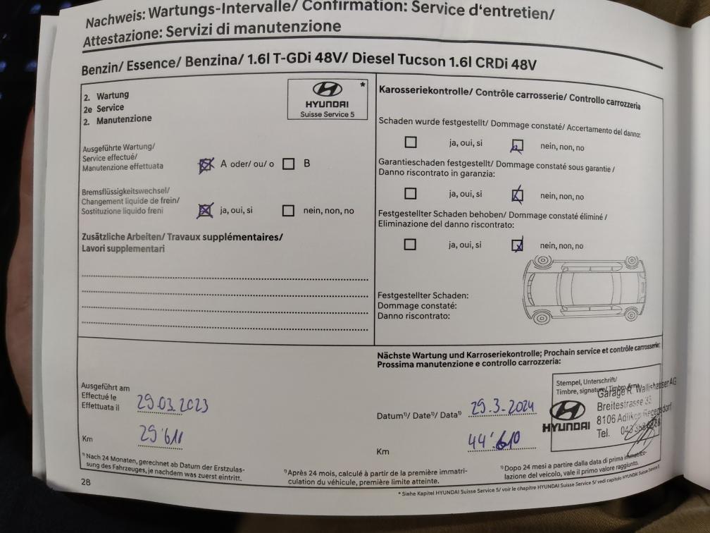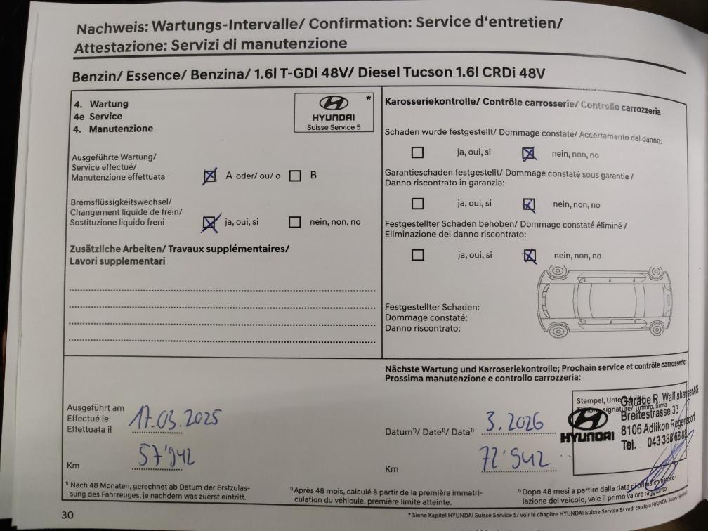 Hyundai Tucson 1.6 T-GDi HEV Vertex 4x4 (Vollhybrid - kein Mild Hybrid) ! sehr gepflegter Wagen in Top Zustand ! Aus 1. Hand, kein Raucherauto, kein Hundeauto Garantiert Unfallfrei Vollausstattung VERTEX (Schweizer Fahrzeug - kein Direktimport) !!! Frisch ab MFK : 28.08.2025 !!! !!! Letzter Service 17.03.2025 !!! 1. Inv.: 15.01.2021 Kilometerstand: 61'950Km Zubehör: 8fach bereift (Kompletträder Original Hyundai Aluminiumfelgen Sommer Profiltiefe 4mm / Winter Profiltiefe 5mm) Garantie: Hochvoltbatterie: 8 Jahre oder 160’000 Kilometer ab 1. Inv.: 01.2021 Sehr gerne geben wir Ihnen persönlich per Email, telefonisch oder persönlich vor Ort genauere Auskünfte zum Zustand der Fahrzeuge. Während der laufenden Auktion können die Fahrzeuge, nach Voranmeldung, besichtigt und zur Probe gefahren werden! Jede Gewährleistung, soweit nach schweizerischem Obligationenrecht (OR) möglich, ist wegbedungen, insbesondere sind Wandelung und Minderung ausgeschlossen. Nach Abschluss der Auktion keine Preisverhandlungen, keine Diskussion betreffend Zustand, Geräusche oder weitere Punkte. Das Fahrzeug kann diverse Gebrauchsspuren aufweisen, wie Dellen, Kratzer, Beulen, Beschädigungen (aussen und innen). Es existiert keine explizite Zustandsbeschreibung. S e r i e n a u s s t a t t u n g (gemäss Auto-I Dat Vin Abfrage): Smart Key + Startknopf, Start + Stopp Automatik, Elektrische Fensterheber vorne + hinten, Aussenspiegel elektrisch einklappbar, Aussenspiegel elektrisch verstellbar und heizbar, Regensensor, Heckklappe elektrisch mit Freihandfunktion, Privacy-Verglasung, Dachreling, Leichtmetallfelgen 19", Reifen-Reparatur Set, Servolenkung geschwindigkeitsabhängig, Fahrwerk elektronisch geregelt, Ottopartikelfilter, Airbag Fahrer und Beifahrerseite, Deaktivierung Beifahrerairbag, Center Airbag vorne, Seitenairbags vorne, Vorhangairbags vorne + hinten, Fernlichtassistent, Spurhalteassistent LDW, Ausstiegs-Assistent, Insassen-Alarm, Verkehrszeichenerkennung & Geschwindigkeitsbegrenzer, Automatische Notbremsung, Müdigkeitserkennung, Stauassistent, Autobahn-Assistenzsystem, Spurverfolgungsassistent, Totwinkel-Assistent mit Video, Querverkehrswarnassistent, Alarmanlage, Isofix-Kindersitzbefestigung, Automatische Distanzregelung ACC, Einparkhilfe vorne, Einparkhilfe hinten, Ferngesteuertes Parken, Rückfahrkamera, 360° Kamera, Reifendruck-Kontrollsystem RDK, Berganfahr- Bergabfahrassistent, Notrufassistent, LED Tagfahrlicht, Statisches Kurvenlicht, LED-Scheinwerfer, LED Rückleuchten, ABS und EBV Elektr. Bremskraftverteilung, ESP Elektronisches Stabilitätsprogramm, Drei Zonen-Klimaautomatik, Lenkrad beheizbar, Lederlenkrad mit Lederschaltknauf, Lederinterieur, Aktive Sitzbelüftung vorn, Vordersitze höhenverstellbar, Sitzheizung vorne, Sitzheizung hinten, Rücksitze geteilt umklappbar 40/20/40, Elektrisch verstellbare Vordersitze, Automatisch abblendbarer Innenspiegel, Ambientebeleuchtung, Gepäcknetz, Premium-Soundsystem, Radio/ USB/ DAB+, Audiofernbedienung am Lenkrad, Bluetooth Freisprecheinrichtung, Navigationssystem, Kartenupdate MapCare, Apple Car Play/ Android Auto, Wireless Charging für mobile Geräte