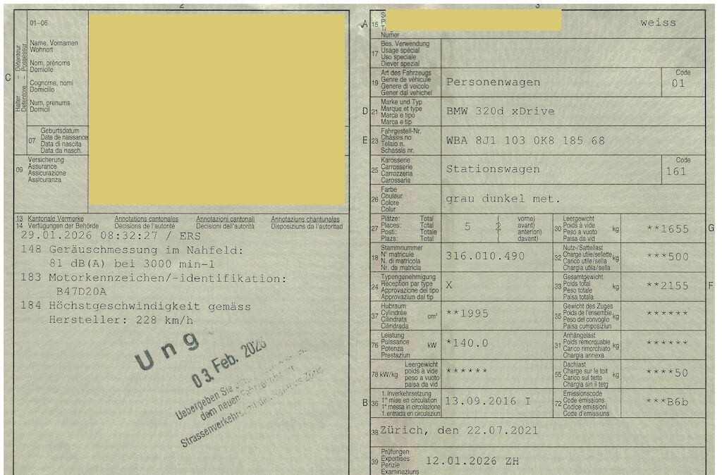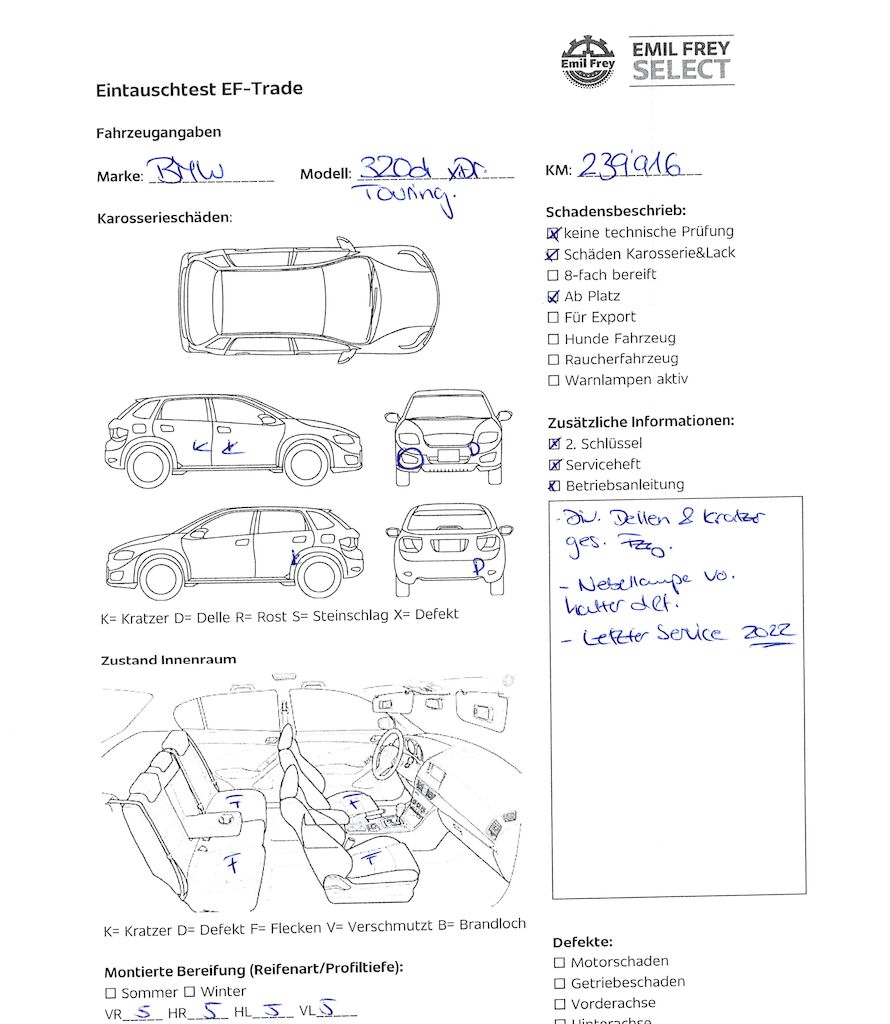 Keine Gewähr auf die Angaben der Sonder- und Serienausstattung / keine mechanische Prüfung. Fahrzeug wurde unzerlegt expertisiert / keine Haftung für allfällige, nach Demontage bekanntwerdenden Mängel. Fahrzeugbereifung und Ausstattung gemäss Fotos / Fahrzeugkauf auf eigenes Risiko ab Platz ohne Nachwährschaft.- Div. Dellen und Kratzer am gesamten Fahrzeug.- Nebellampenhalter vorne rechts def.- DPF frisch ersetzt und geprüft.- Letzter Service 2022