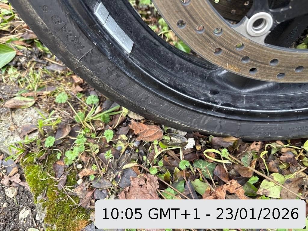 Armaturen, Aussenspiegel links, Front, Fussraster links, Gabelholm, Griff links, Kühler, Motor, Motorgehäuse, Rad vorne, Scheinwerfer, Schutzblech vorne, Sitz, Verschalungen vorne, Zündschloss