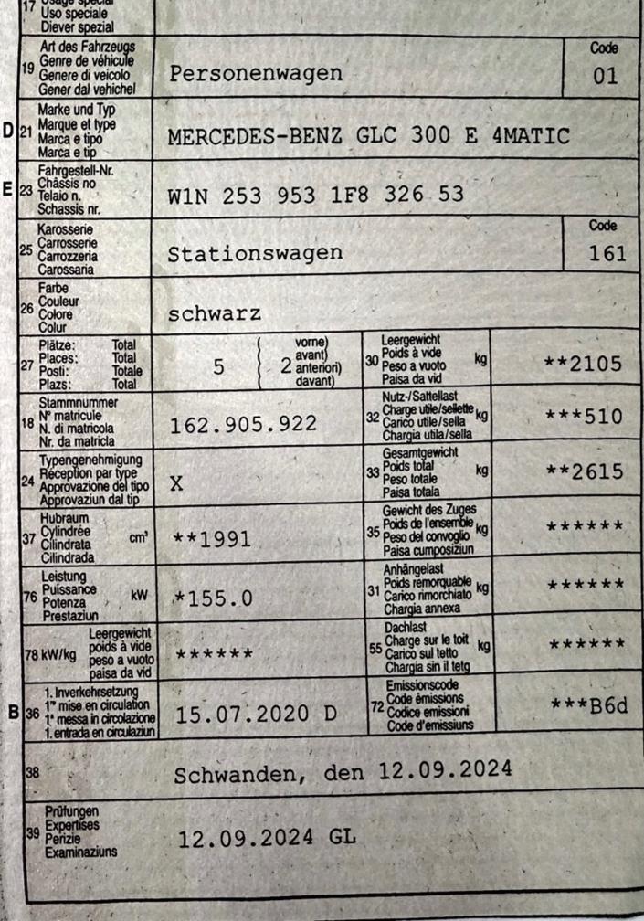 Am Fahrzeug wurde kein Werkstatttest gemacht (Für sichtbare oder nicht sichtbare Mängel wird nicht gehaftet). Wir testen & kontrollieren nicht alle Funktionen vom Fahrzeug. Das Risiko liegt somit vollumfänglich beim Käufer. Nachdem der Höchstbietende den Zuschlag erhalten hat, gibt es keine Nachverhandlung, auch wenn nicht deklarierte Mängel zum Vorschein kommen sollten. Ab Platz ohne Garantie, die Gewährleistung ist vollständig ausgeschlossen, damit insbesondere auch Wandelung und Minderung. _ Sonderausstattung gemäss Eurotax ohne Gewähr _ Media: Vorrüstung für Fahrzeugfernsteuerung Fahrwerk: Federung für grössere Bodenfreiheit Dekor: Zierelemente in Klavierlack-Optik schwarz / Aluminium Ladeanschluss für Wechselstrom 7,4kW EASY-PACK-Heckklappe mit elektrischer Betätigung zum Öffnen und Schliessen Ladekabel für Wallbox und öffentliche Ladestationen, 4m,spiralisiert Lackierung: Uni-Lackierung Polster:Polsterung Ledernachbildung ARTICO / Microfaser DINAMICA Media: Smartphone Integration Sitze: Beifahrersitz elektrisch verstellbar mit Memory-Funktion Sitze: Fahrersitz elektrisch verstellbar mit Memory Lenkrad: Multifunktionslenkrad beheizbar Volldigitales Instrumenten-Display Licht: MULTIBEAM LED Scheinwerfer Warnweste für Fahrer Dekor: Zierelemente Esche schwarz/Aluminium Trittbretter in Aluminiumoptik mit Gumminoppen Akustikglas Sitze: Rücksitze heizbar Sitze: Vordersitze heizbar Scheibenwaschanlage und Scheibenwaschdüsen beheizt Paket: Park-Paket mit 360 -Kamera inkl.aktiver Park-Assistent und PARKTRONIC Paket: Spiegel-Paket Diebstahlwarnanlage mit Innenraumüberwachung und Abschleppschutz Paket:Night-Paket Paket: Konnektivitäts-Paket Dekor:Instrumententafel in Ledernachbildung ARTICO