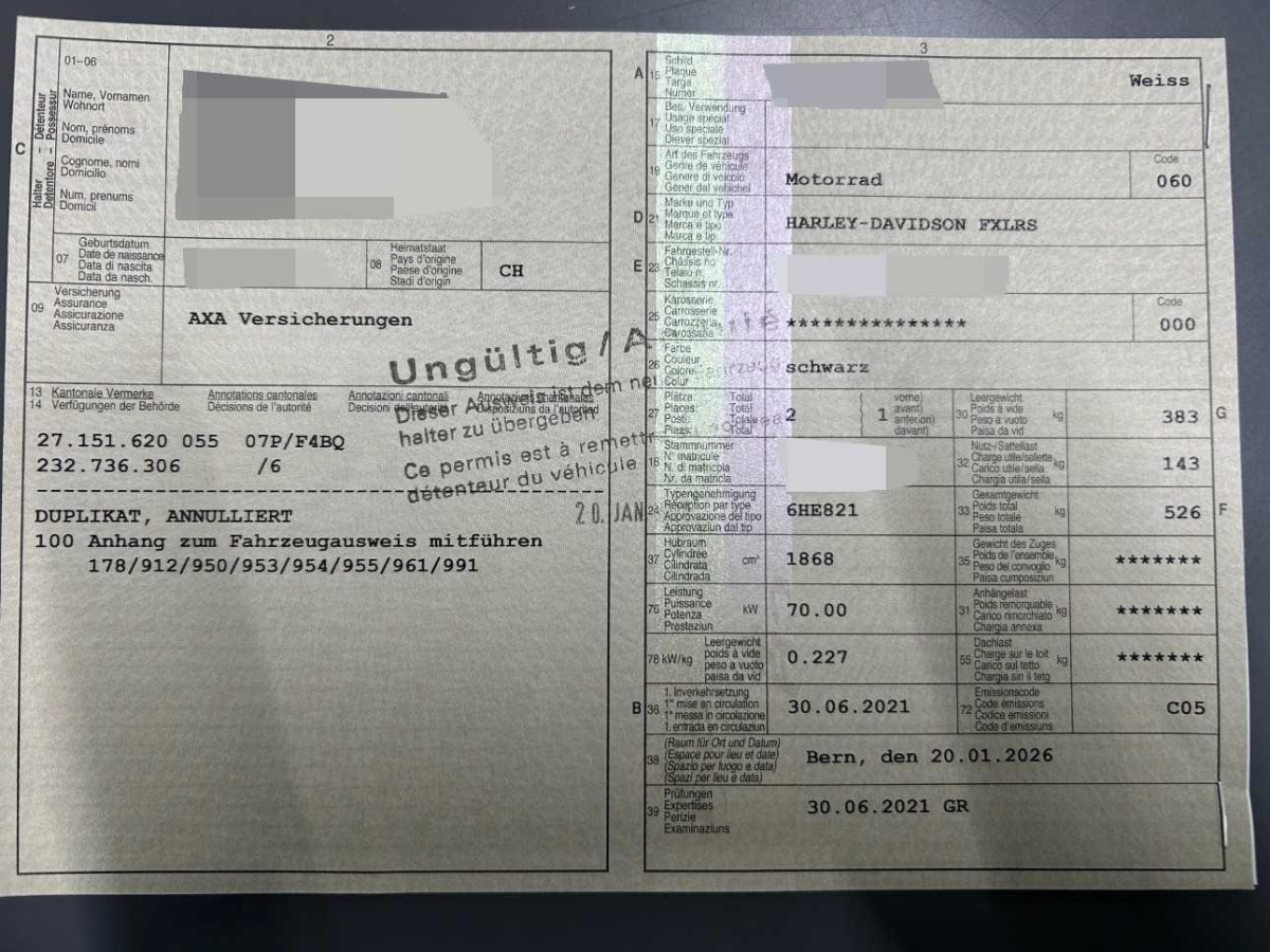 Das Fahrzeug wird mit folgenden Zubehör verkauft,AuspuffanlageDr. JekillFairing KitHeckrahmen & Dämpfer hintenBrembo Bremsen-KitFussrastenLenker West Coast & Griffe sowie AnbauteileBlinker-SetDiverses Felgen & Stossdämpfer sowie Gabel vorneDiverse UmbauarbeitenDie (vom Fahrzeugexperten) ermittelten Reparaturkosten beziehen sich auf das versicherte Ereignis. Allfällige zusätzliche, nicht versicherte Schäden/Vorschäden, sind in den Reparaturkosten nicht enthalten. Die deklarierten Ausstattungsmerkmale können von der effektiven Ausstattung abweichen.AchtungBei einem Hochvoltsystem - Spannungsfreiheit prüfen. Sicherheitshinweise und Betriebsanleitungen des Herstellers konsultieren und befolgen.