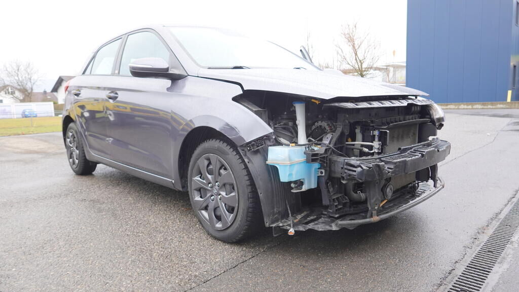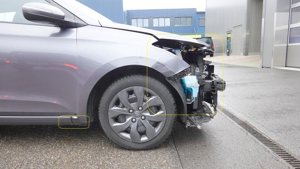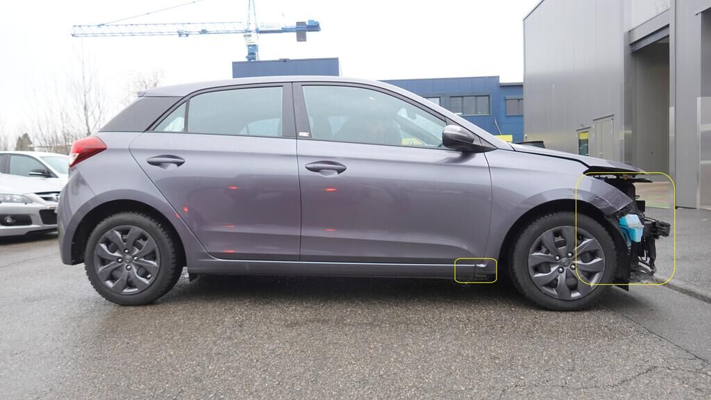 Stossstangenabdeckung und Zierelemente gerissen. Scheinwerferglas gerissen. Kotflügel eingedellt und aufgestaucht, Einstiegsschwelle rechts verformt. Unter der demontierten Stossstangenabdeckung kann erkannt werden, das auch der Stossstangenträger und die Radhausschale im Anstossbereich beschädigt wurden. Kollisionskontaktspuren am Rad vorne rechts auszumachen. Motor Getriebe Vorderachse Hinterachse Airbags ausgelöst: 0 Nein ( Abfallcode 16.01.04ak )