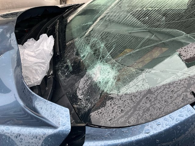 Windschutzscheibe ist gerissen. Türscheibe vorne links ist zerbrochen / beschädigt. Türscheibe hinten rechts ist zerbrochen / beschädigt.