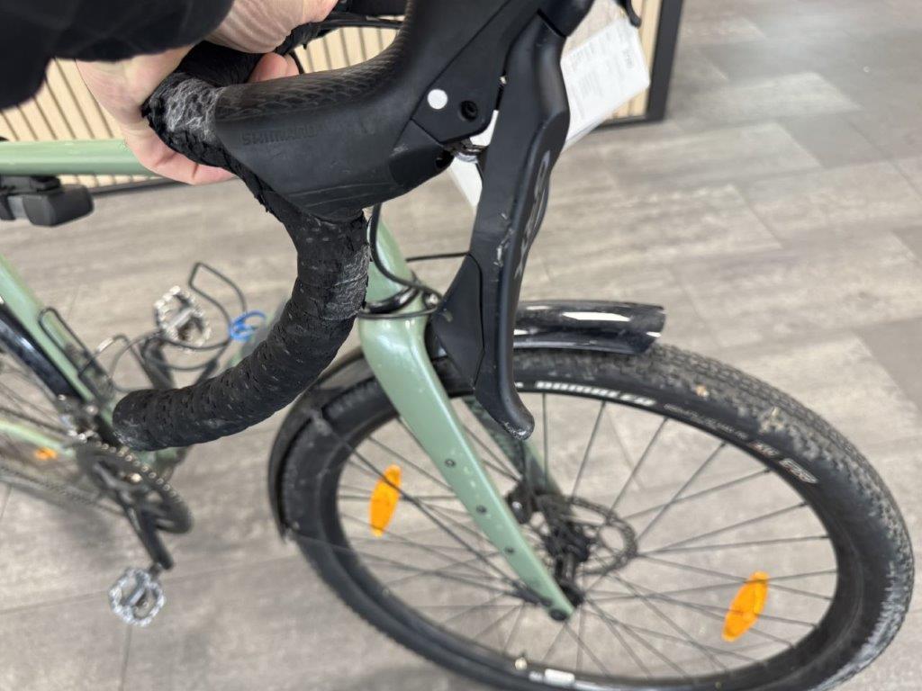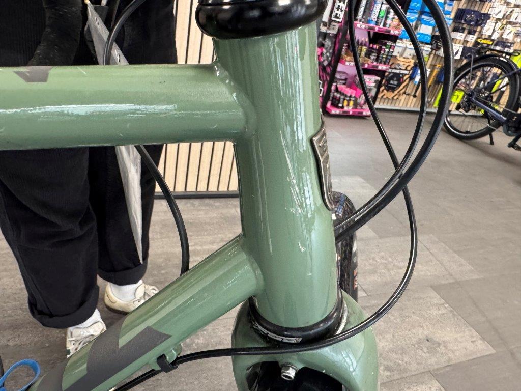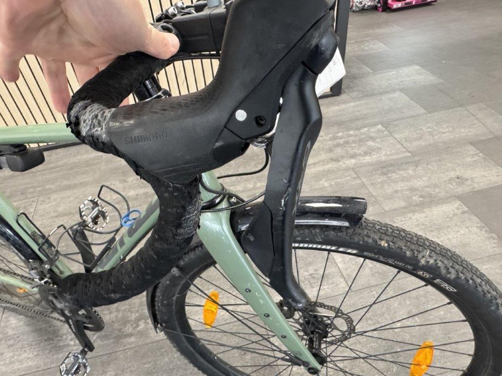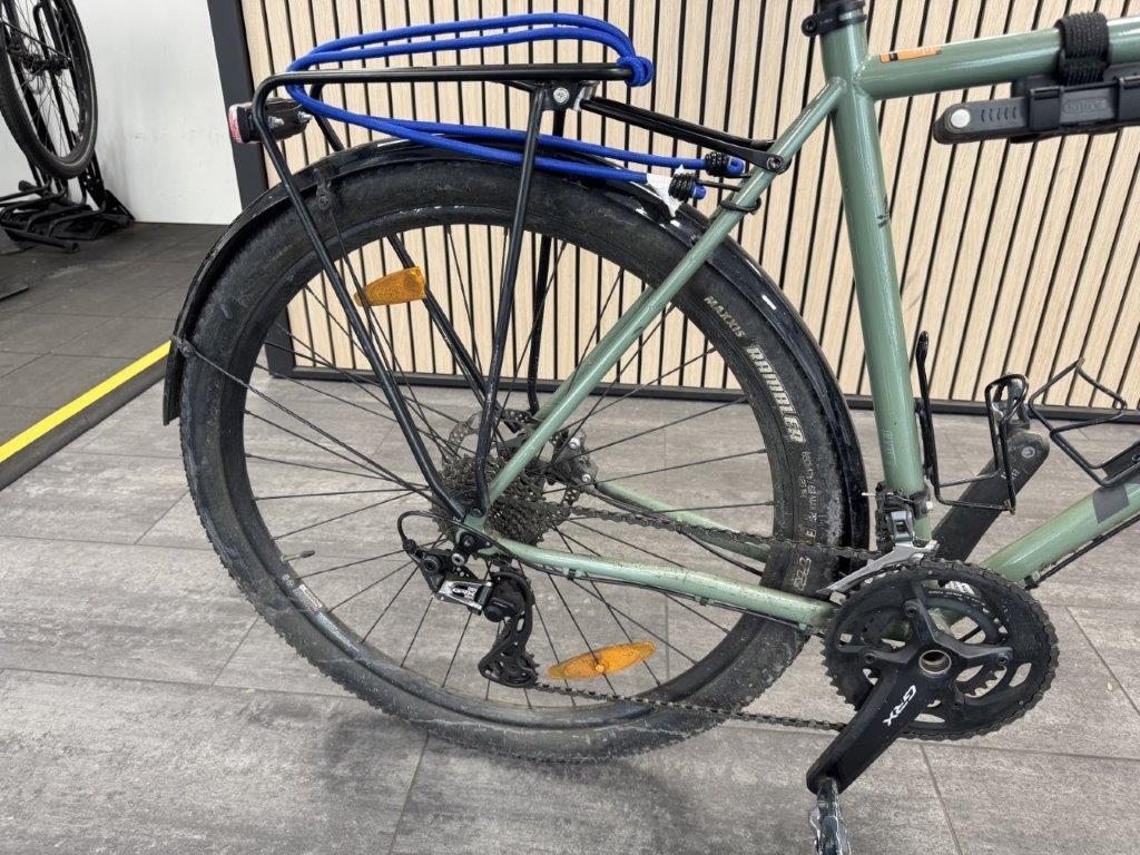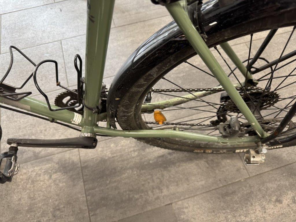 Rahmen vorne zerkratzt. Lenker verbogen. Brems- und Schalthebel zerkratzt und verbogen. Rahmen hinten verbogen. Laufräder verbogen. Pedale verbogen und zerkratzt. Gepäckträger verbogen. Schaltwerk zerkratzt und verbogen. Diverse Teile leicht beschädigt.