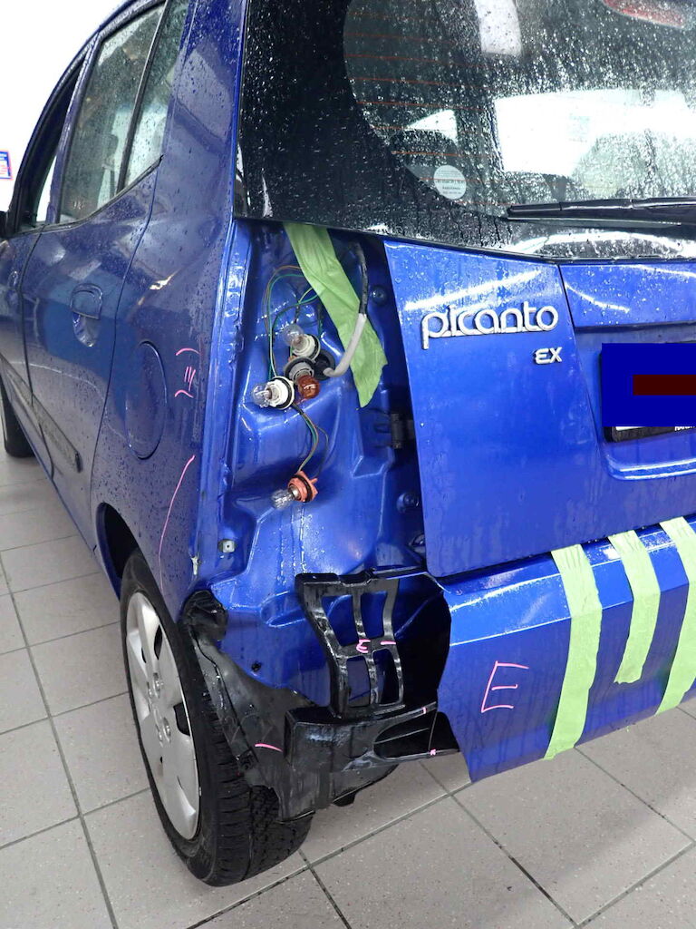 Anprall Ecke L, dabei wurde die Stossstange beschädigt, die Rückleuchte sowie die Seitenwand HL Motor Getriebe Vorderachse Hinterachse Airbags ausgelöst: 0 unbekannt ( Abfallcode 16.01.04ak )