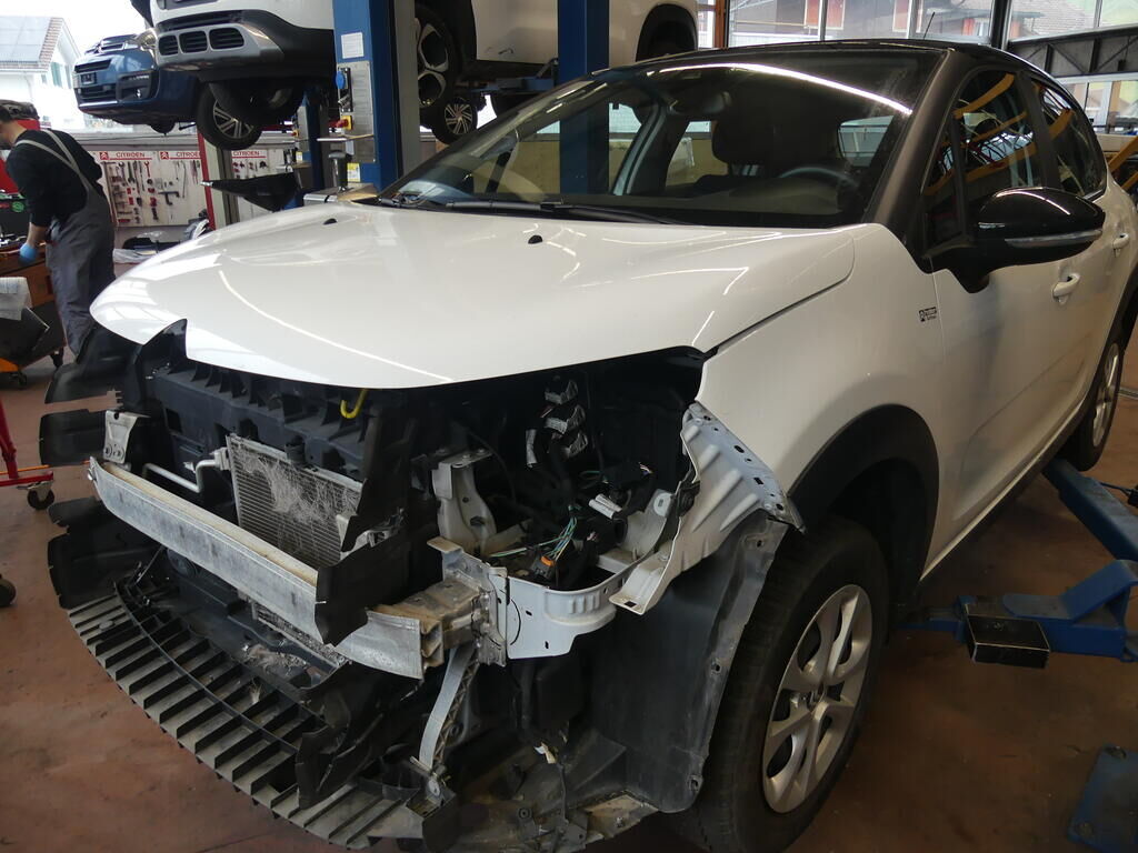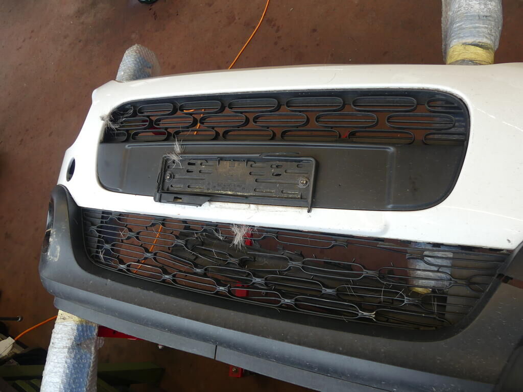 Stossstange gerissen, Kühlergitter gebrochen, Pralldämpfer, Scheinwerfer links und rechts, Nebellampen und Tagfahrlicht beschädigt. Klimakondensator deformiert. Motor Getriebe Vorderachse Hinterachse Airbags ausgelöst: 0 Nein ( Abfallcode 16.01.04ak )