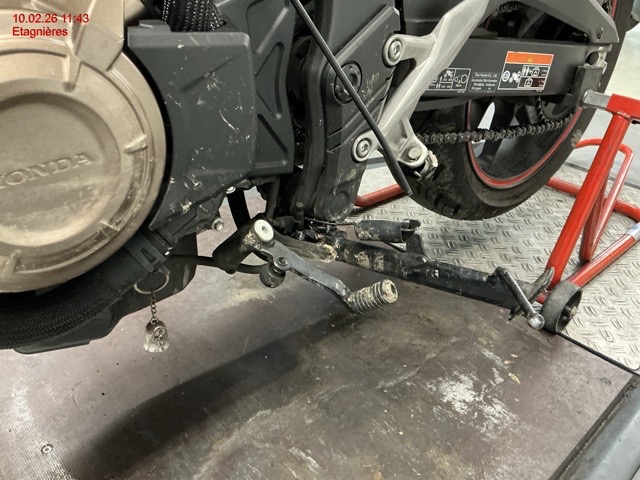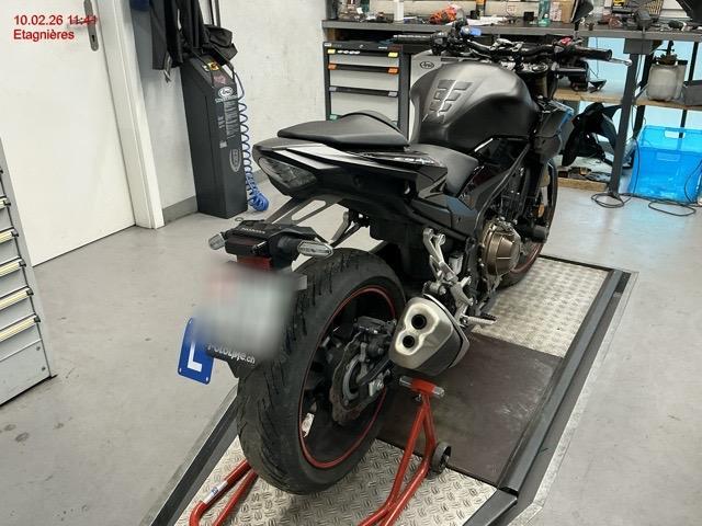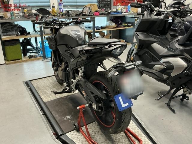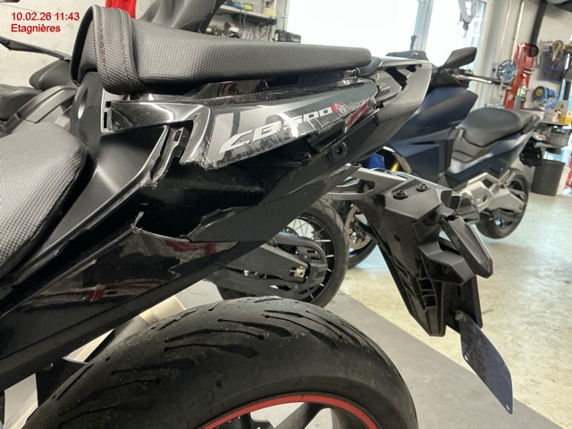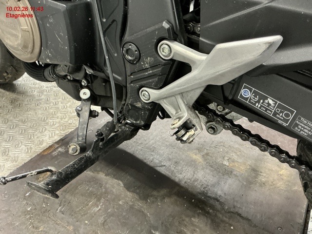 Embase de fourche avant gauche, guidon, levier de frein, indicateur de direction gauche, carénage gauche et droite, sélecteur de vitesse, repose pied, béquille latéral..... Cadre déformé (support béquille latéral), carter latéral moteur, liste non exhaustive / Dommages préexistants: selon photos