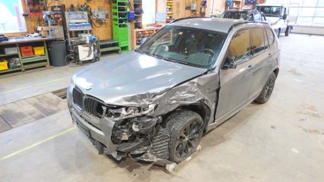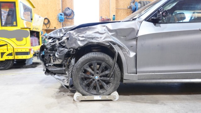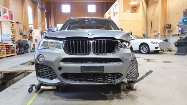 Front links eingedrückt. Radhaus vorne links eingedrückt / gestaucht. Fahrzeugvorbau nach rechts verschoben.