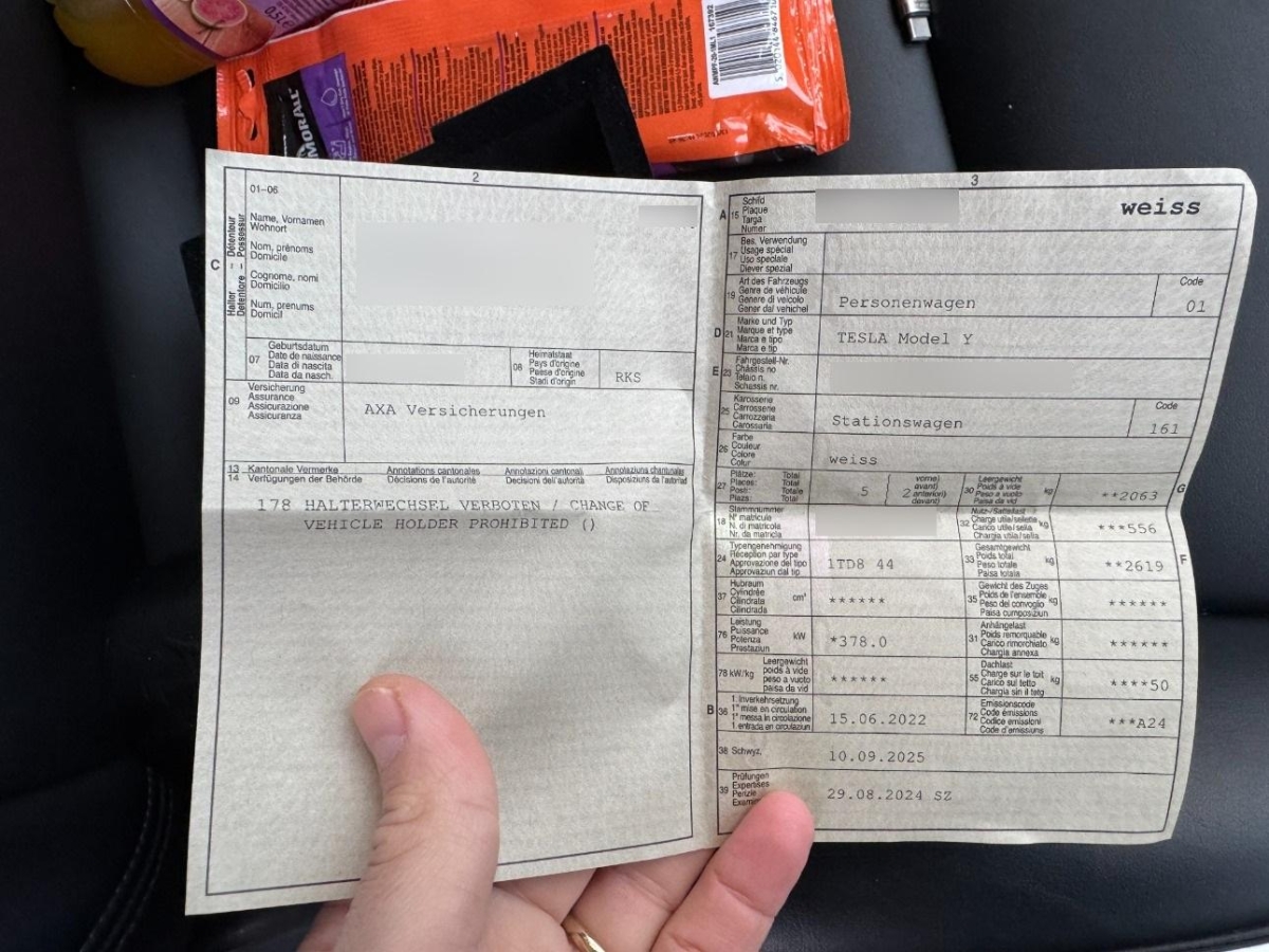 Lenkrad: Lenkrad elektrisch längs- und höhen-verstellbar, Heckscheibenheizung, Supercharger Network Access + Pay-as-you-go, Zentralverriegelung mit Fernbedienung, Assist: Parkassistent, Licht: LED-Nebelscheinwerfer, Sitze: Ausführung 5 Sitzplätze, Lackierung: Pearl-Lackierung, Assist: Kollisionswarnung, Media: Premium-Audiosystem - 14 Lautsprecher - Subwoofer - 2 Verstärker und Klangfeldprozessor, Licht: Drittes Bremslicht LED, Mittelkonsole mit Ablagefach, Easy Entry - Sie können eine Easy Entry-Einstellung festlegen, die die Position des Lenkrads und des Fahrersitzes anpasst, um den Ein- und Ausstieg in bzw. aus Model Y zu erleichtern, Licht: Fernlichtautomatik, Scheibenwischer vorne mit Intervall, Keyless Entry, Seitenaufprall-Schutzsystem, Performance Upgrade, Media: Touchscreen, Assist: Rückfahrkamera, Sitze: Vordersitze elektrisch verstellbar 12-fach, Antiblockiersystem (ABS), Lenkrad: Lenkradheizung, Getriebe: Direktantrieb, Assist: Adaptive Cruise Control, Panorama-Glasdach, Assist: ABS und TCS, Aussenspiegel automatisch abblendend, Bordcomputer, 12-Volt-Steckdose vorne, Kabinenkamera, Sitze: Fünfsitzer-Innenraum, Klima: Klimatisierungsautomatik, Getönte Scheiben, Elektrische Fensterheber vorne, Licht: Nebelschlussleuchte, Assist: Spurhalteassistent, Airbag: Seiten- und Kopfairbags, Sitze: Rücksitzlehne geteilt abklappbar, Polster: Kunstleder-Polsterung, Sicherheitsgurtsystem, Servolenkung, Dekor: Black PUR Interior, Media: Bluetooth Freisprecheinrichtung, Media: USB-A Anschluss im Handschuhfach mit abnehmbaren 128 GB Speichermedium, Räder: Leichtmetallfelgen 19J mit Pneu, Licht: LED-Tagfahrlicht, Assist: Lenkassistent - Mit den neuen Tesla Vision-Kameras, Sensoren und der erhöhten Rechenleistung kann Ihr Tesla nun über komplexere Strassenführungen navigieren., Räder: 19" Gemini Wheels, Assist: Basic Autopilot, Licht: LED Scheinwerfer, Gurtstraffer vorne, Sitze: Rücksitze heizbar, Sitze: Vordersitze heizbar, Reifendruck-Kontrollanzeige, Innenraumbeleuchtung - Deckenleuchten - Ambientebeleuchtung - Leseleuchten - Lenkradbeleuchtung, Media: Media Player - Radio - Bluetooth - Streamen - Spotify - Caraoke - TuneIn - Tidal, Fußgängerwarnsystem, Reifenreparatur-Set (Tire Fit), Aussenspiegel rechts und links beheizt, elektrisch verstell- / und einklappbar, Airbag: Airbag Beifahrer deaktivierbar, Assist: Frontaufprallwarnung, Media: Navigationssystem mit Onboard-Karten, Assist: Park Distance Control (PDC), Airbag: Airbag Fahrer und Beifahrer, Media: Wi-Fi Hotspot, Lenkrad: Multifunktionslenkrad, Wegfahrsperre elektronisch, Sitze: Kopfstützen verstellbar, Elektronisches Stabilitäts-Programm (ESP), Garantie: 8 Jahre oder 192'000 km auf Elektroantriebssystem und Batterie (ab 1. Inv.), Garantie: 4 Jahre oder 80'000 km, Assist: Notbremsassistent, ISOFIX Kindersitzvorrichtung