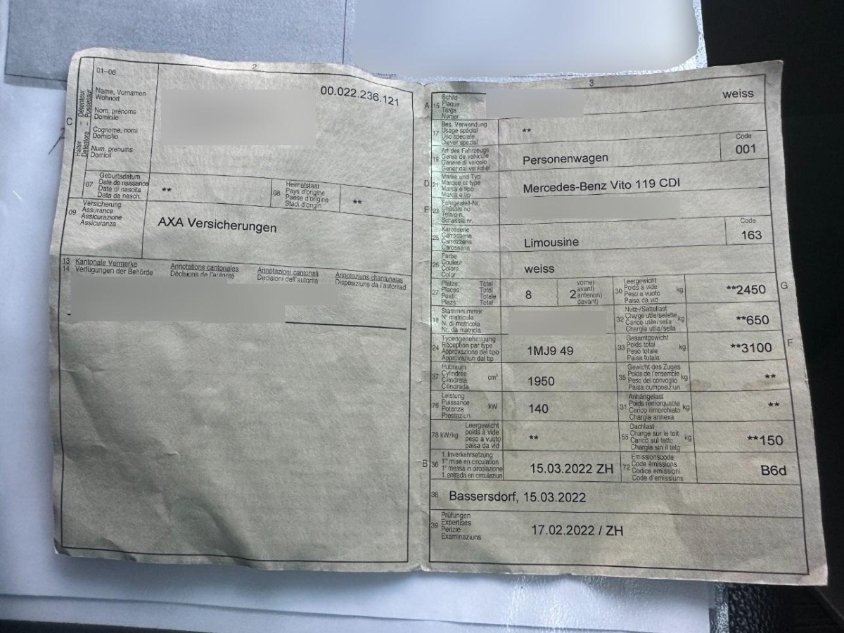 Antriebsschlupfregelung (ASR), Tourer PRO Der Vito Tourer PRO ist besonders flexibel und vielseitig. Er hat bereits serienmäßig 8 Sitzplätze, Thorax- und Windowbags vorn sowie viele Komfortausstattungen an Bord. Aufgrund der variablen Bestuhlungsmöglichkeiten und der Sitzbefestigungen im Fahrgastraum mit Schnellverriegelung lässt er sich auch als 5-, 4- oder 2-Sitzer einrichten. Platz für 8 Personen serienmäßig. Optional ist er sogar um einen neunten Sitzplatz erweitern. Wartet sperriges Ladegut auf eine Transportmöglichkeit, ents, Licht: Scheinwerfer Halogen, Media: Radiogeneration 2, Gewichtsvariante 3.100 kg, Sitze: Komfort-Beifahrersitz, Sitze: 3er-Sitzbank Komfort 2.Reihe, äusserer Sitz klappb ., Bereifung ohne Vorgabe Fabrikat, Wärmedämmendes Glas rundum, Feststellbremse (Fusspedal), Haltegriff im Fond, Zwei Cupholder, Emissionsklasse Euro 6d-TEMP N1 GR.III/N2, Licht: 3. Bremsleuchte, Media: Kommunikationsmodul (LTE), ECO Start-Stopp-Funktion, Fahrwerk: Elektrische Lenkung, Licht: Fahrlichtassistent (automatisches Fahrlicht), Polster: Polster Stoff Caluma schwarz, Getriebe: Achsübersetzung i = 2,733, Türen: Schiebetür rechts, Dieselpartikelfilter, Airbag: Airbag Fahrerseite, Airbag: Thorax-Pelvis-Sidebag Beifahrer, Assist: Warnlampe für Wischwasserfüllstand, 12V Steckdose, Fahrwerk: Scheibenbremse an VA und HA, Assist: Reifendrucküberwachung an VA u. HA, drahtlos, Lenkrad: Multifunktionslenkrad mit Reiserechner, Fenster vorn links, fest in Seitenwand/Schiebetür, Licht: Innenraumleuchte(n) im Fond, Assist: Seitenwindassistent, Assist: ATTENTION ASSIST, Elektronisches Stabilitäts-Programm (ESP), Paket: BlueEFFICIENCY-Paket Fuel-Efficiency-Generator und ECO Start-Stopp-Funktion, Lackierung: Uni-Lackierung, Fahrwerk: Basisfahrwerk Plus, Verbandstasche, Türen: Aktiver Feststeller Schiebetür, Sitze: 3er-Sitzbank Komfort 1.Reihe mit klappbarem äusserem Sitz mit Armlehne, Dekor:Kunststoffboden im Fahrgastraum, Anhängelast 2500 kg, Räder: Radvollabdeckung, Dekor: Dachverkleidung, Türen: Komfort-Öffnung u.Schliessung mit IR-Fernbedienung, Generatormanagement, Garantie: Garantie: 2 Jahre, Airbag: Thorax-Pelvis-Sidebag Fahrer, Sitze: Beifahrersitz verstellbar Manuell in 4 Richtungen einstellbar für hohen Sitzkomfort., Assist: Wartungsintervall 40.000 km, Media: Digitaler Radioempfang (DAB/DAB+), Aussentemperaturanzeige, Türen: Kindersicherung an Türen im Fahrgastraum, Licht: Beleuchtete Spiegel für Sonnenblenden, Elektrik für Anhängersteckdose, Haltegriffe für Einstieg Fahrer und Beifahrer, Gurtwarneinrichtung für Beifahrersitz, Wegfahrsperre elektronisch, Sitze: Komfort-Fahrersitz, Drehzahlmesser elektronisch, Warmluftkanal zum Fahrgastraum, Warndreieck, Fenster in Heckklappe mit Wisch-/Waschanlage, Vliesbatterie 12 V/92 Ah, Unterbodenverkleidung, aerodynamisch, Gurtwarneinrichtung für Fahrersitz, Sitze: Armlehnen für Bestuhlung im Fahrgastraum, Media: Kombiinstrument mit Pixel-Matrix-Display, Dekor: Innenverkleidung gehobene Ausführung, Türen: Heckklappe, Abschleppöse vorne/hinten einschraubbar, Antiblockiersystem (ABS), Generator 14 V / 250 A, Komfort Fensterheber elektrisch F/BF, Servolenkung, Licht: Adaptives Bremslicht, Licht: Umfeldbeleuchtung Heckklappe, Media: Audio 10 Mit dem Audio 10 können Sie viel mehr als Radio hören – zum Beispiel über die Freisprechfunktion telefonieren oder Musik von einem mobilen Endgerät abspielen. Dazu verfügt das 1-DIN-Gerät über eine Bluetooth® Schnittstelle und einen USB-C-Anschluss mit Ladefunktion., Abschliessbares Handschuhfach, Pufferbatterie für Startvorgang, Haupttank 70 Liter, Airbag: Airbag Beifahrer, Getriebe: 9G-TRONIC, Innenspiegel, Assist: Tempomat, Räder: Stahlräder 6,5 J x 17, Komfort-Dachbedieneinheit, Sommerreifen, Assist: Mercedes-Benz Notrufsystem, Assist: Pannenmanagement, Sitzbef. Fond m.Schnellverriegelung 2 Sitzreihen, Media: 2-Wege-Lautsprecher vorn und hinten, Türen: Laderaum-Schiebetür links, Regensensor, Assist: Wartungsintervallanzeige ASSYST, Airbag: Windowbags für Fahrer und Beifahrer, Aussenspiegel heizbar und elektrisch verstellbar, Fenster fest hinten, Befestigungspunkte im Dachrahmen, Abgasreinigung SCR Generation 3, Lenkrad: Lenkrad in Neigung und Höhe verstellbar, Haltegriffe für Einstieg, Assist: Berganfahrhilfe, Fenster vorn rechts, fest in Seitenwand/Schiebetür, Licht: Leuchtweitenregulierung, Zuheizer elektrisch
