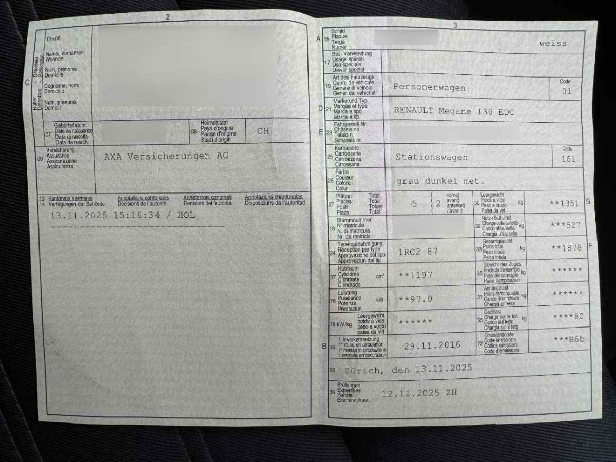 Zentralverriegelung mit Fernbedienung und automatischer Türverriegelung, Kreuzstütze für Fahrersitz verstellbar, Ablagefächer im Fussboden, Einstiegsschienen, Window-Kopfairbags, Ablagefach im Kofferraum, Elektrische Kindersicherung, Radiosat Classic CD, MP3 4x15W Bluetooth, Licht: Nebelscheinwerfer, Räder: Reifenreparatur-Set (Tire Fit), Lenkrad und Schalthebelgriff in Leder, Lenkrad längs- und höhenverstellbar, Navigationssystem Tom Tom, Klimaanlage, Keyless Drive Hands-free, Fussraumbeleuchtung vorne, ISOFIX-Kindersitzverankerungen hinten (2), Türgriffe aussen in Wagenfarbe, Aussenspiegel rechts und links beheizt, elektrisch verstell- / und einklappbar, Komfortblinker, Abgedunkelte Seiten- und Heckscheibe, Elektrische Fensterheber vorne mit Schnellsenktaste, Regensensor für Scheibenwischer vorne, Leseleuchten vorne, Licht: Drittes Bremslicht, 4 Leichtmetallfelgen 17J mit Pneu, Sequentielles 6-Gang-Getriebe mit Automatikfunktion, Dachreling mattchrom, Heckscheiben-Wisch-/Waschanlage mit, Park Distance Control vorne und hinten, Servolenkung, Seitenairbag für Fahrer und Beifahrer, Berganfahrassistent, Aktive Kopfstützen, Licht: LED-Tagfahrlicht, Radiofernbedienung mit Satellit, Katalysator geregelt, Assist: Rückfahrkamera, Tempomat mit Geschwindigkeitsbegrenzer, Automatische Parkbremse, Touchscreen, Luftaustrittdüsen 2. Sitzreihe, Pollenfilter (Staubfilter), Sitze: Kopfstützen hinten höhenverstellbar, Räder: Reifendruck-Kontrollanzeige, Gurtkontrolle, 2-Zonen-Klimaautomatik, Sitze: Mittelarmlehne vorne, Bremsassistent (BAS), SD Karte (Europa), iPod + USB Anschluss, 3-Punkt-Sicherheitsgurte auf allen Plätzen, Kartentasche an der Rückenlehne, Airbag: Airbag Fahrer und Beifahrer, Scheibenwischer vorne mit Intervall, Stoff-/Kunstleder-Ausstattung, Innenrückspiegel automatisch abblendend, Gurtstraffer vorne und hinten, Halogenscheinwerfer, Radiosat 3D Sound By Arkamys CD, MP3 Bluetooth, Notbremslicht (EBS), Sitze: Fahrersitz in der Höhe verstellbar, ABS, EBD elektronische Bremskraftverteilung, Seitenschutzleisten in Schwarz, Aussenspiegel in Wagenfarbe, Sonnenblenden mit beleuchtetem Schminkspiegel, AUX-Anschluss, Licht: Nebelschlussleuchte, Bordcomputer, Keyless Drive, Elektrische Fensterheber hinten, Wegfahrsperre elektronisch, Airbag Beifahrer deaktivierbar, Beifahrerlehne umklappbar, 3 Kopfstützen hinten, Kopfstützen vorne höhenverstellbar, Elektronisches Stabilitäts-Programm (ESP) - mit Antriebsschlupfregelung (ASR) und Untersteuerungskontrolle (CSV), Automatisches Einschalten der Abblendlichter, Begleitlicht-Funktion (Show me home)