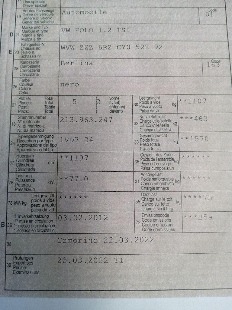 Non è stata effettuata alcuna ispezione tecnica (prova in officina) Le spie di avvertimento si accendono durante il funzionamento. Spia AIR BAG accesa Vari danni alla carrozzeria/verniciatura dovuti all'usura Danno posteriore DX e specchio DX Cerchio rovinato sul bordo Parabrezza puntinato Faro anteriore DX con condensa Sedili anteriori usurati e sporchi Motor Getriebe Vorderachse Hinterachse Airbags ausgelöst: 0 Nein ( Abfallcode 16.01.04ak )