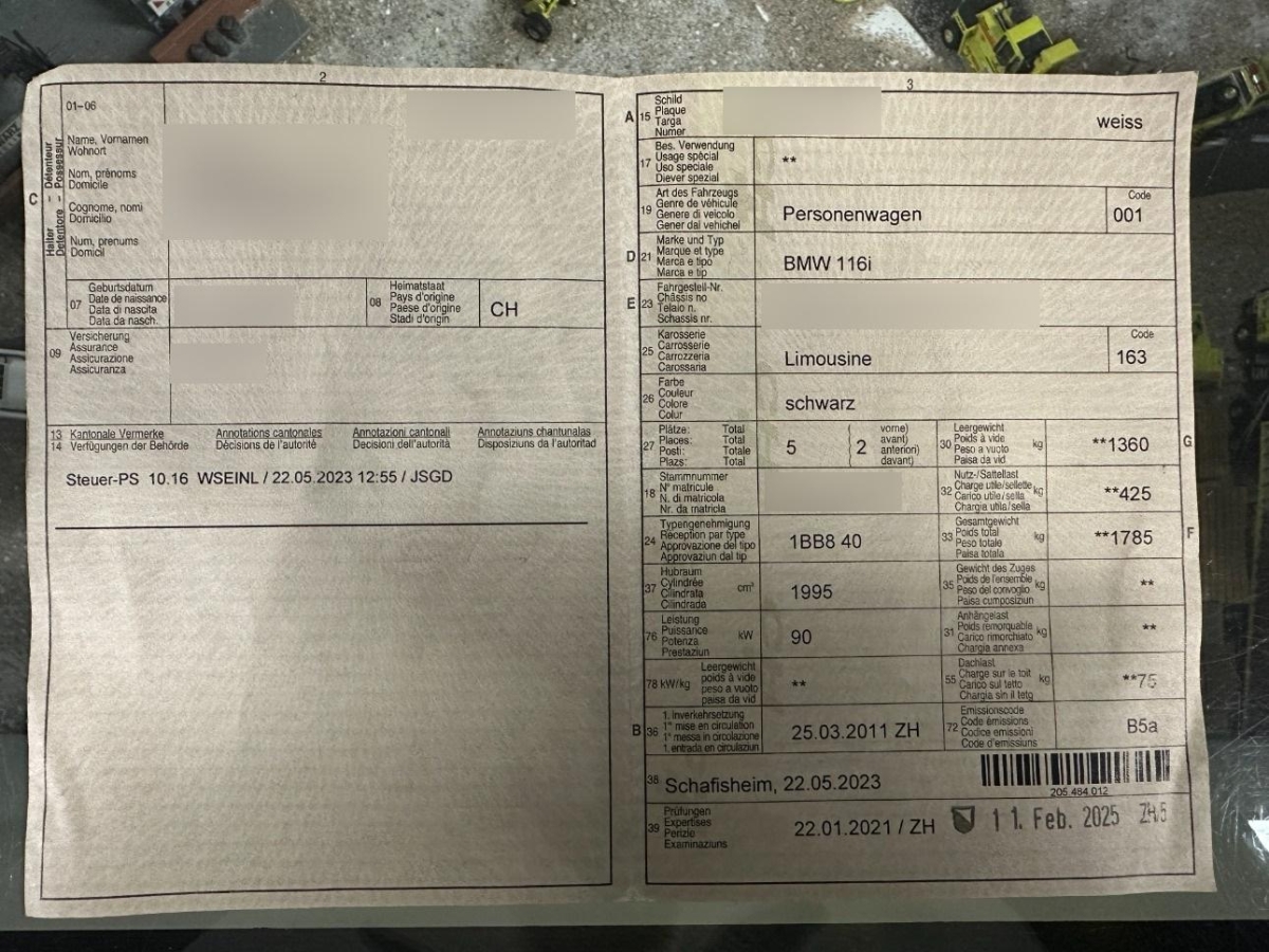 Rücksitzlehne geteilt abklappbar, Halogenscheinwerfer, Aussenspiegel rechts und links elektrisch verstellbar, Skisack, iDrive-System, Einstiegsschienen, Nichtraucherausführung, Aux-In Anschluss, Leuchtweitenregulierung elektrisch, 3-Punkt-Sicherheitsgurte auf allen Plätzen, Drittes Bremslicht, Tagfahrlicht, Heckscheiben-Wisch-/Waschanlage, Drehzahlmesser, BMW Mobility System, Befestigungsösen im Laderaum, Lackierung: Uni-Lackierung, Radiovorbereitung, Antenne, Entstörung und 6 LS, Wegfahrsperre elektronisch, Zweiklanghorn, Beleuchtetes Handschuhfach, Elektrische Fensterheber vorne + hinten, Heckscheibenheizung, Seitenairbags, Reifendruckverlust-Warnsystem, Window-Kopfairbags, Bremsassistent (BAS), Dynamische Stabilitätskontrolle (DSC), Kombi-Instrumente mit Chromzierringen, Oelstandsanzeige, Gurtkontrolle, Radzierblenden, 12-Volt-Steckdose vorne, Digital Uhr, Tageskilometerzähler, Stossstangen und Aussenspiegel in Wagenfarbe, Bordcomputer, Innenlicht-Abschaltverzögerung, Abschliessbare Radschrauben, Stahlräder, Licht: Nebelschlussleuchte, Getriebe: 6-Stufen-Automat Steptronic, Aussentemperaturanzeige, Veloursfussmatten vorne und hinten, Durchladeklappe, Radio BMW Business CD, Grün getönte Scheiben, Make up-Spiegel rechts, Blinkleuchten seitlich vorn weiss, Zentralverriegelung mit Fernbedienung, Abblendlichtausschaltverzögerung 'Follow me home', Verbandskasten, Automatische Stabilitäts- und Traktions- kontrolle, Make up-Spiegel links, Kofferraumfernentriegelung, Lenkrad: Lenkrad längs- und höhenverstellbar, Vordersitze höhenverstellbar, Interieurleisten in Silber, Türgriffe in Wagenfarbe, Katalysator geregelt, Scheibenwischer vorne mit Intervall, 3 Kopfstützen hinten, Wartungsintervall-Anzeige, Seitenaufprall-Schutzsystem, Gurtstraffer vorne, Schutzleisten für Stossstangen vorne und hinten, Weisse Blinkleuchten, Lichtwarnsummer, Airbag: Airbag Fahrer und Beifahrer, Lenkung, elektrisch unterstützt, Stoff-Ausstattung, Assist: Cornering Brake Control (CBC), ISOFIX Kindersitzvorrichtung, Bremsbelag-Verschleissanzeige, Check-Control-System
