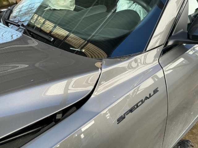 Front eingedrückt. Frontblech/Maskenblech eingedrückt. Radhaus vorne rechts eingedrückt / gestaucht. Fahrzeugvorbau verschoben.