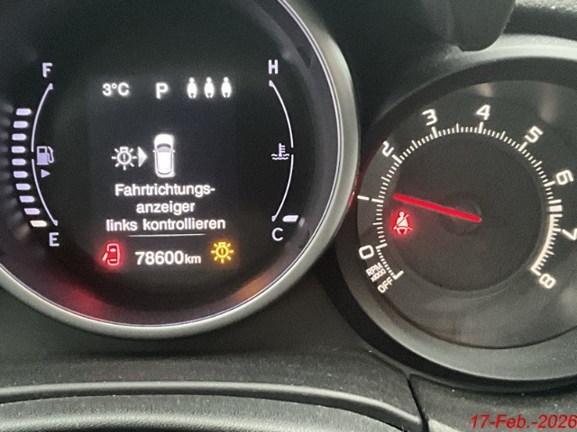 ABS, EBD elektronische Bremskraftverteilung, Dunkel getönte Scheiben hinten, Tempomat, Servolenkung, Assist: Antriebsschlupfregelung (ASR), Aussentemperaturanzeige, Airbag: Window-Kopfairbags, Getönte Scheiben, Sitze: Fahrersitz höhenverstellbar, Licht: Nebelscheinwerfer, Pollenfilter (Staubfilter), Heckscheibenheizung, Aussenspiegel rechts und links beheizbar und elektrisch verstellbar, Wegfahrsperre elektronisch, Elektronische Parkbremse, Start-/Stopp-Automatik, ISOFIX Kindersitzvorrichtung, Verchromtes Auspuffendrohr, Digital Uhr, Stoff-Ausstattung, Gurtstraffer vorne, Elektrische Fensterheber vorne + hinten, Drehzahlmesser, Dachspoiler in Wagenfarbe, Elektronisches Stabilitäts-Programm (ESP), Multifunktionslenkrad mit Radiobedienung, Sequentielles 6-Gang-Getriebe mit Automatikfunktion, Scheibenwischer vorne mit Intervall, Stossstangen in Wagenfarbe, Rücksitzlehne geteilt abklappbar, Zentralverriegelung mit Fernbedienung, Berganfahrhilfe (Hill Holder), Leichtmetallfelgen 17J, Licht: Nebelschlussleuchte, Assist: Bremsassistent (BAS), Airbag: Airbag Beifahrer deaktivierbar, Licht: Tagfahrlicht, Räder: Reifendruck-Kontrollanzeige, Klimaanlage, Lenkrad: Lederlenkrad, Instrumententafel mit LCD Display, 3-Punkt-Sicherheitsgurte auf allen Plätzen, Airbag Fahrer und Beifahrer inkl. Seitenairbags, Autoradio mit Touchscreen, Bedienelement am Lenkrad, Bluetooth, Multimediasystem Uconnect (Freisprecheinr.,USB, AUX),DAB+, Licht: Drittes Bremslicht, Schalthebelknauf in Leder, Heckscheiben-Wisch-/Waschanlage, Katalysator geregelt, Lenkrad: Lenkrad längs- und höhenverstellbar