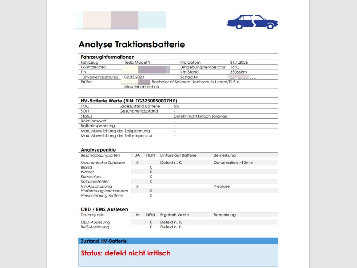 Weitere Beschädigungen zusätzliche Bescheidungen: Radaufhängung vorne und hinten. (Risiko)Die Hochvoltbatterie ist defekt nicht kritisch. Das Fahrzeug wird ohne HV-Batterie verkauft.Die (vom Fahrzeugexperten) ermittelten Reparaturkosten beziehen sich auf das versicherte Ereignis. Allfällige zusätzliche, nicht versicherte Schäden/Vorschäden, sind in den Reparaturkosten nicht enthalten. Die deklarierten Ausstattungsmerkmale können von der effektiven Ausstattung abweichen.AchtungBei einem Hochvoltsystem - Spannungsfreiheit prüfen. Sicherheitshinweise und Betriebsanleitungen des Herstellers konsultieren und befolgen.