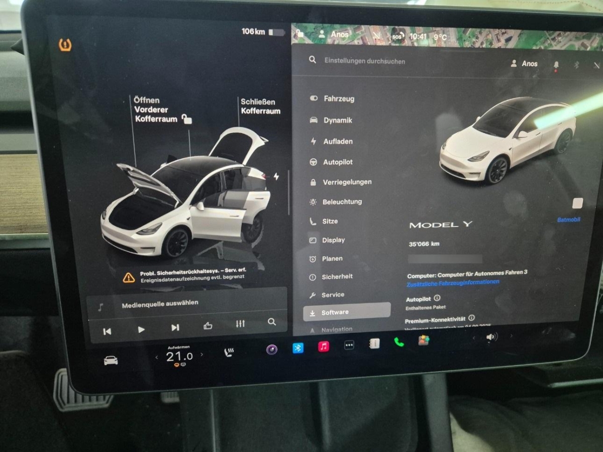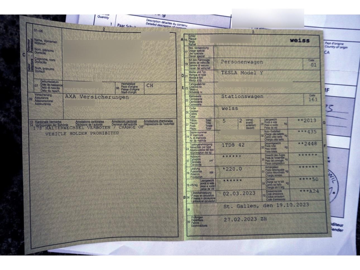 Media: Wi-Fi Hotspot, Media: Navigationssystem mit Onboard-Karten, Assist: Adaptive Cruise Control, Kabinenkamera, Assist: Basic Autopilot, Dekor: Black PUR Interior, 12-Volt-Steckdose vorne, Assist: Lenkassistent - Mit den neuen Tesla Vision-Kameras, Sensoren und der erhöhten Rechenleistung kann Ihr Tesla nun über komplexere Strassenführungen navigieren., Servolenkung, Assist: Park Distance Control (PDC), Lenkrad: Lenkradheizung, Lackierung: Pearl-Lackierung, Getriebe: Direktantrieb, Elektrische Fensterheber vorne, Bordcomputer, Media: Bluetooth Freisprecheinrichtung, Polster: Kunstleder-Polsterung, Sitze: Vordersitze elektrisch verstellbar 12-fach, Keyless Entry, Airbag: Airbag Beifahrer deaktivierbar, Media: Media Player - Radio - Bluetooth - Streamen - Spotify - Caraoke - TuneIn - Tidal, Licht: Drittes Bremslicht LED, Wegfahrsperre elektronisch, Assist: ABS und TCS, Licht: LED Scheinwerfer, Licht: LED-Tagfahrlicht, Innenraumbeleuchtung - Deckenleuchten - Ambientebeleuchtung - Leseleuchten - Lenkradbeleuchtung, Elektronisches Stabilitäts-Programm (ESP), Seitenaufprall-Schutzsystem, Airbag: Seiten- und Kopfairbags, Sitze: Vordersitze heizbar, Panorama-Glasdach, Aussenspiegel rechts und links beheizt, elektrisch verstell- / und einklappbar, Reifenreparatur-Set (Tire Fit), Performance Upgrade, ISOFIX Kindersitzvorrichtung, Easy Entry - Sie können eine Easy Entry-Einstellung festlegen, die die Position des Lenkrads und des Fahrersitzes anpasst, um den Ein- und Ausstieg in bzw. aus Model Y zu erleichtern, Licht: Fernlichtautomatik, Fußgängerwarnsystem, Assist: Parkassistent, Lenkrad: Lenkrad elektrisch längs- und höhen-verstellbar, Aussenspiegel automatisch abblendend, Licht: Nebelschlussleuchte, Sitze: Ausführung 5 Sitzplätze, Assist: Kollisionswarnung, Heckklappe elektrisch, Scheibenwischer vorne mit Intervall, Lenkrad: Multifunktionslenkrad, Klima: Klimatisierungsautomatik, Sitze: Vordersitze belüftet, Assist: Frontaufprallwarnung, Sitze: Kopfstützen verstellbar, Assist: Rückfahrkamera, Ladekabel, Garantie: 8 Jahre oder 192'000 km auf Elektroantriebssystem und Batterie (ab 1. Inv.), Räder: 19" Gemini Wheels, Licht: Nebelscheinwerfer, Assist: Notbremsassistent, Airbag: Airbag Fahrer und Beifahrer, Heckscheibenheizung, Assist: Spurhalteassistent, Sicherheitsgurtsystem, Garantie: 4 Jahre oder 80'000 km