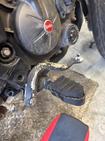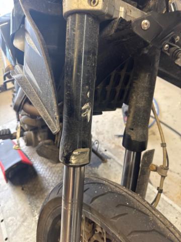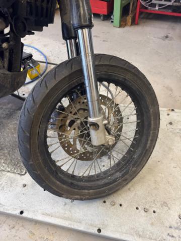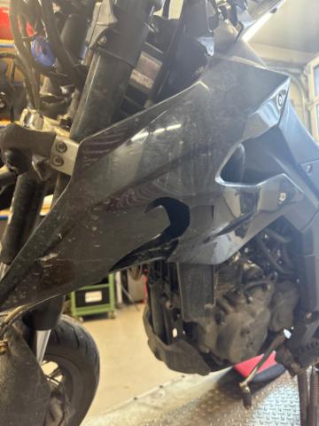 Schutzblech vorne defekt. Vorderrad beschädigt. Gabel beschädigt. Lenker verbogen. Frontblech/Maskenblech eingedrückt. Fahrzeugvorbau verschoben.