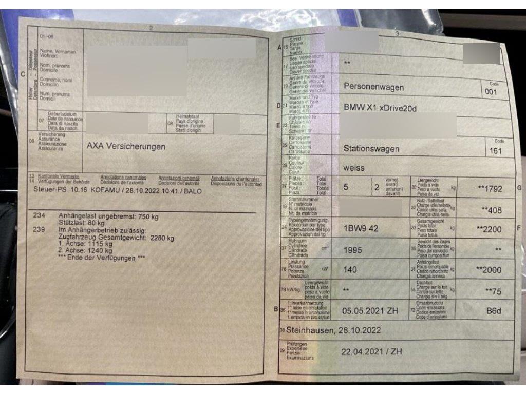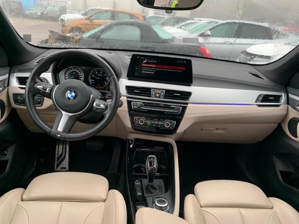 Licht: LED Scheinwerfer, Airbag: Airbag Beifahrer deaktivierbar, Media: Lautsprecher 2 Mitteltöner vorn, 2 Mitteltöner hinten, 2 Tieftöner als Zentralbässe unter den Vordersitzen, Verstärkerleistung 100 W, Allradantrieb permanent, Airbag: Airbag Fahrer und Beifahrer, Aussenspiegel elektrisch verstellbar, beheizt Chromglas, Spiegelglas Fahrerseite asphärisch, Spiegelglas Beifahrer konvex, Performance Control, Assist: Anfahrassistent, Servotronic, Sitze: Ausführung 5 Sitzplätze, Dynamische Stabilitätskontrolle (DSC), Media: 6,5" Display (Auflösung: 800×480 Pixel), Bedienung mittels iDrive Controller, USB-Anschluss, Bluetooth-basierte Freisprecheinrichtung und Audiostreaming, Assist: Park Distance Control hinten, Bordcomputer, Türen: Automatische Heckklappenbetätigung - Elektrisch öffnende/schliessende Heckklappe - Bedienungstasten in Türverkleidung Fahrerseite und Heckklappe - Heckklappenschloss, elektrisch mit Soft-Close-Automatic und Verriegelungsüberwachung, Wärmeschutzverglasung, Media: ConnectedDrive Services - Beinhaltet die kostenlose Nutzung von Fahrzeug Apps über BMW Online (inkl. Zugriff auf Wetterinformationen, Nachrichten, Adresssuche etc.) für 3 Jahre - Registrierung erforderlich für personalisierbare Dienste - Der Dienst BMW Online ist ab 2 Wochen vor Ablaufdatum via BMW ConnectedDrive Store kostenpflichtig verlängerbar, Armauflage, Räder: Radschraubensicherung, Start/Stop-Funktion, BMW Teleservices, Airbag: Window-Kopfairbags vorne und hinten, Media: DAB+ Tuner, Media: USB-Anschluss, Airbag: Seitenairbag für Fahrer und Beifahrer, Elektrische Fensterheber, ISOFIX-Befestigungspunkte für Kindersitz an den äusseren Rücksitzen, Veloursfussmatten, Lenkung, elektrisch unterstützt, Warndreieck, Elektrische Lenkung (EPS), Lenkrad: Multifunktionslenkrad, Assist: Geschwindigkeitsregelung mit Bremsfunktion, Paket: Ablagenpaket Fahrer- und Beifahrersitz: Netze an Sitzlehnerückseite Mittelkonsole, hinten: eine Doppel-USB-Buchse (nur Laden: Typ C/3,0 A) Mittelarmlehne im 20%-Segment der Fondsitzlehne. Inklusive 2 Cupholder (mit jeweils 4 Flaps zur Fixierung und Klappdeckel) im vorderen Bereich.Formschlüssig,Klappfunktion des 20%-Segments bleibt vollständig erhalten Im Gepäckraum: Netz, schwarz, mit Rahmen, links, rechts Steckdose (12 V), rechts, mit Klappdeckel, Getriebe: 8-Stufen-Automat Steptronic, Regensensor für Scheibenwischer vorne, Licht: LED-Tagfahrlicht, Hill Descent Control (HDC), Partikelfilter und Oxydationskatalysator, Licht: LED Nebelscheinwerfer, BMW Mobility System, Lackierung: Uni-Lackierung, Antiblockiersystem (ABS), Halogenscheinwerfer, Steckdose 12V, Remote Services - Nutzung von Remote Services (z.B. Öffnen/Verriegeln der Türen) - Senden von Zieladressen an das Fahrzeug über die BMW Connected App für Smartphones - Anzeige des Fahrzeugstandortes in der Karte über den Vehicle Finder - Laufzeit: unbegrenzt, Sitze: Fondsitze, Sitzlehne mit 40:20:40-Klappung, Aussenspiegelgehäuse mit integrierter Zusatzblinkleuchte in LED, Pollenfilter (Staubfilter), 3-Punkt-Sicherheitsgurte auf allen Plätzen, Paket: Lichtpaket Lichtquellen LED-Technologie: - Make-Up-Spiegel-Leuchten - Ambientelicht, vorne und hinten - Leseleuchten, vorne und hinten - Beleuchtung Ablagefach Centerstack - Ambiente Instrumententafelbeleuchtung aus Dekorleiste Beifahrerseite - Türspiegelbeleuchtung, indirekt aus Dekorleiste - Fussraumleuchten, vorne und hinten - Türgrifferkennung, aussen - Vorfeldbeleuchtung - Zweifarbige X-Logo Projektion aus Aussenspiegel Fahrerseite - Handschuhkastenbeleuchtung (Leuchtmittel), Air Curtain, Fahrerlebnisschalter inkl. ECO PRO, Assist: Active Guard Speed Limit Assist Auffahrwarnung mit City-Anbremsfunktion, BMW BluePerformance mit AdBlue, Zentralverriegelung mit Fernbedienung, Lenkrad: Lenkrad längs- und höhenverstellbar, Assist: Dynamische Traktionskontrolle (DTC), Dachreling schwarz, Intelligenter Notruf, Räder: Reifendruck-Kontrollanzeige, Klima: 2-Zonen-Klimaautomatik, Dekor: M Interieurleisten Aluminium Hexagon mit Akzentleiste Blau matt, Fahrwerk: Serienfahrwerk, Lenkrad: M Lederlenkrad, Paket: M Aerodynamicpaket, Polster: Stoff ''Micro Hexagon'' / Sensatec, Räder: 18" M Leichtmetallräder Doppelspeiche 570 Ferricgrau 7,5 J×18/Bereifung 225/50 R 18
