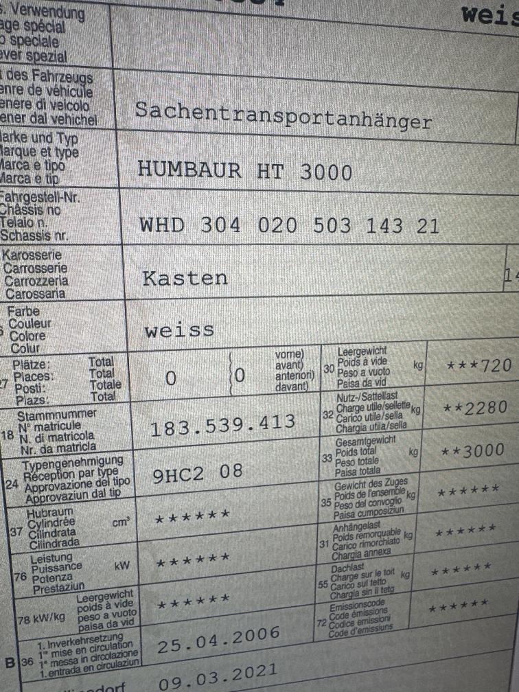 SIE BIETEN AUF EINEN SACHENTRANSPORTER DER MARKE HUMBAUR TYP HT 3000 Details bitte dem Ausweis entnehmen. Achtung, Leergewicht stimmt nicht. ist höher. Mit Kofferaufbau und Holzregalen um ca 1500KG! INHALT GEMÄSS LETZTEM BILD GEHÖRT NICHT ZUM ANGEBOT. DIENT LEDIGLICH DAZU UM ZU ZEIGEN FÜR WAS DER ANHÄNGER GENUTZT WURDE. BESENREIN. RAMPE: ANTIRUTSCHKLEBER. FOLIE VORHANDEN UND WIRD DEM ALLFÄLLIGEN KÄUFER MITGEGEBEN. Zustand: div Beulen, und Schäden. Teils Repariert. So vom aktuellen Besitzer gekauft und seitdem 2x Vorgeführt. zuletzt im Mai 2025 ERSATZRAD VORHANDEN. RÄDER IM CA 22 ERSETZT INKL. ERSATZRAD. Der Anhänger kann gerne bei uns besichtigt werden. KM IST EINE ANNAHME. NATÜRLICH OHNE NACHWEIS ODER VERBINDLICHKEIT Kauf ab Platz ohne Garantie. Hinweis zum Fahrzeugverkauf Es wurde keinem Werkstatttest durchgeführt. Eine Überprüfung sämtlicher Funktionen hat nicht stattgefunden. Für sichtbare sowie nicht sichtbare Mängel wird keinerlei Haftung übernommen. Der Verkauf erfolgt ab Platz, ohne Garantie oder Gewährleistung. Jegliche Ansprüche auf Wandelung oder Minderung sind ausdrücklich ausgeschlossen. Nach Zuschlag bzw. Kaufabschluss sind Nachverhandlungen ausgeschlossen, auch im Falle nachträglich entdeckter und nicht deklarierter Mängel. Das Risiko trägt vollumfänglich der Käufer.